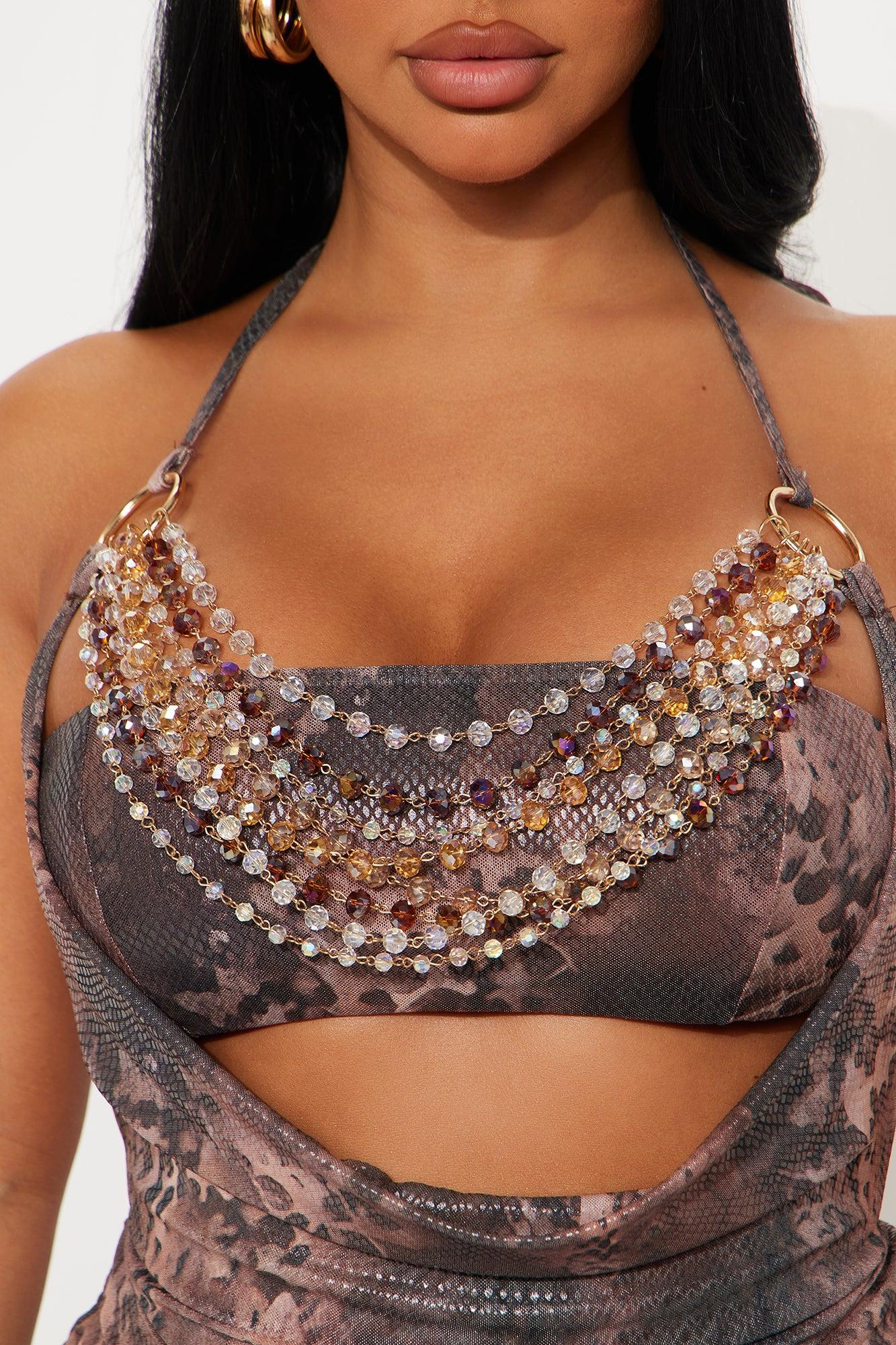 Available In Brown/combo. Gemstones Mini Dress Straight Neckline Halter Cut Outs Open Back Lined Stretch Length Measured Flat = 32" Self: 95% Polyester 5% Spandex Lining: 100% Polyester Imported California Proposition 65WARNING: Cancer and Reproductive Harm - www.P65Warnings.ca.gov.