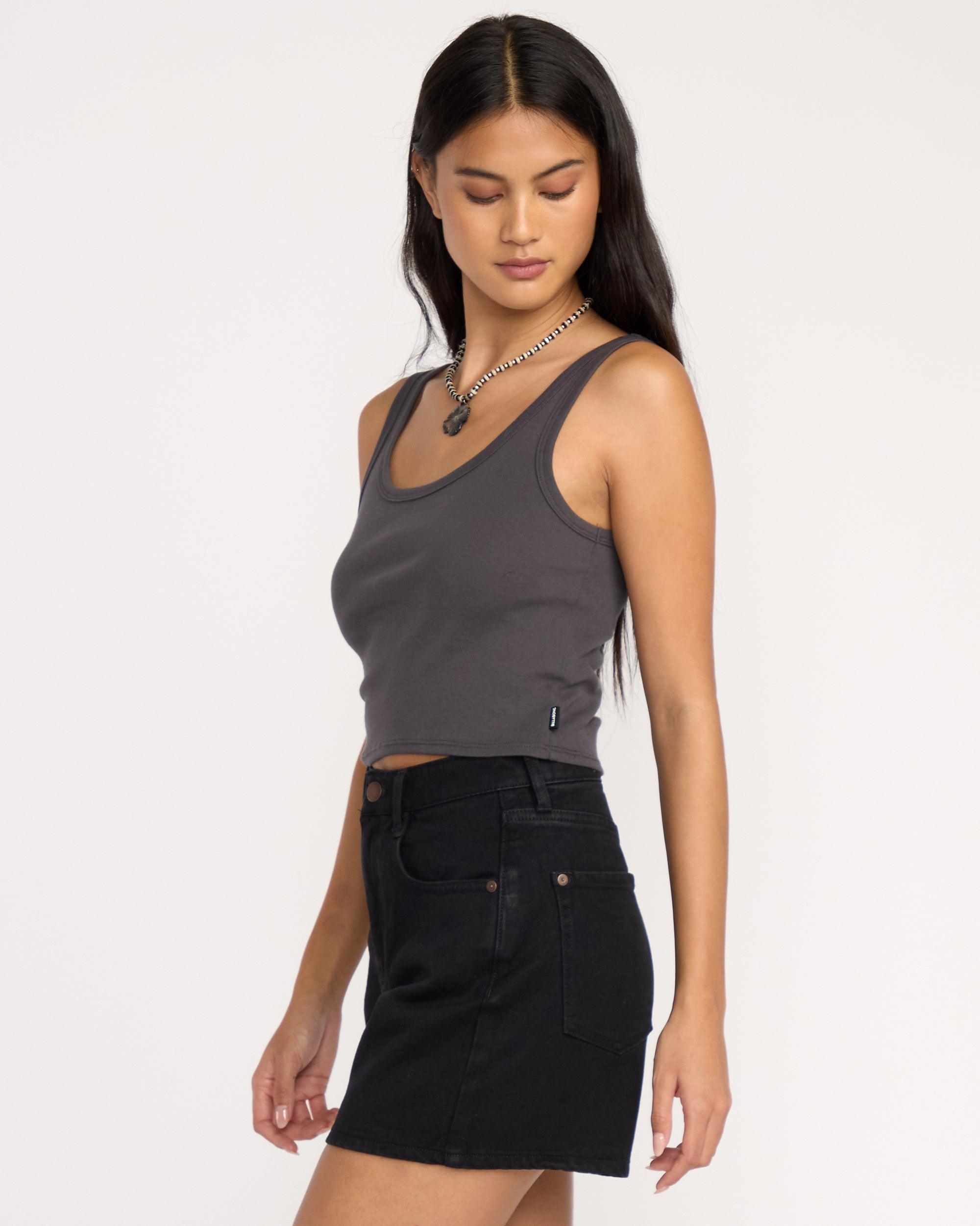Soft, sun-warmed cotton rib skims the skin in our Goddess Knit Tank-a fitted, scoop-neck staple that layers effortlessly, holds shape all day, and finishes with a subtle woven label nodding to quiet confidence. Features 100% Cotton flat rib jersey Fitted tank Scoop neckline Woven label