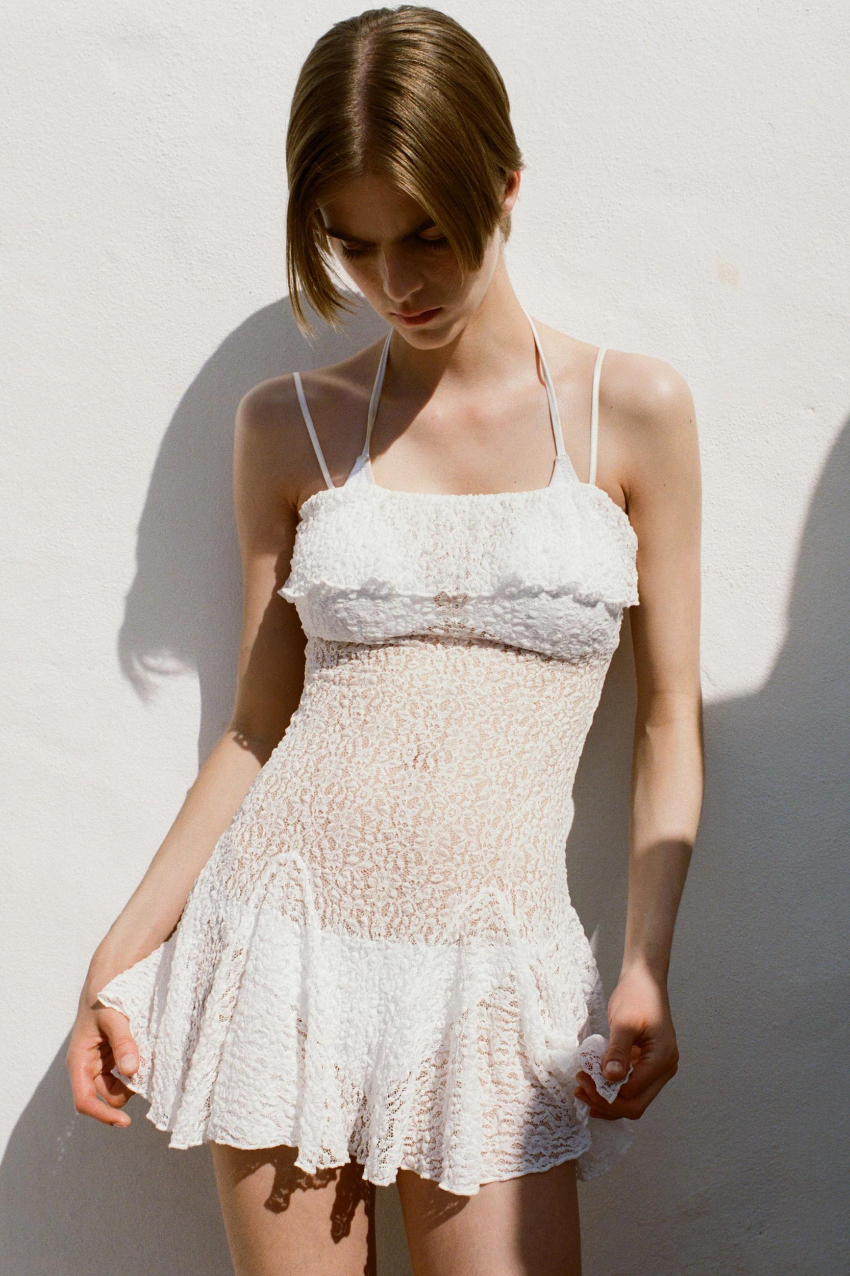 Short semi-sheer dress with round neckline and spaghetti straps. Godet hem. This item is unlined.