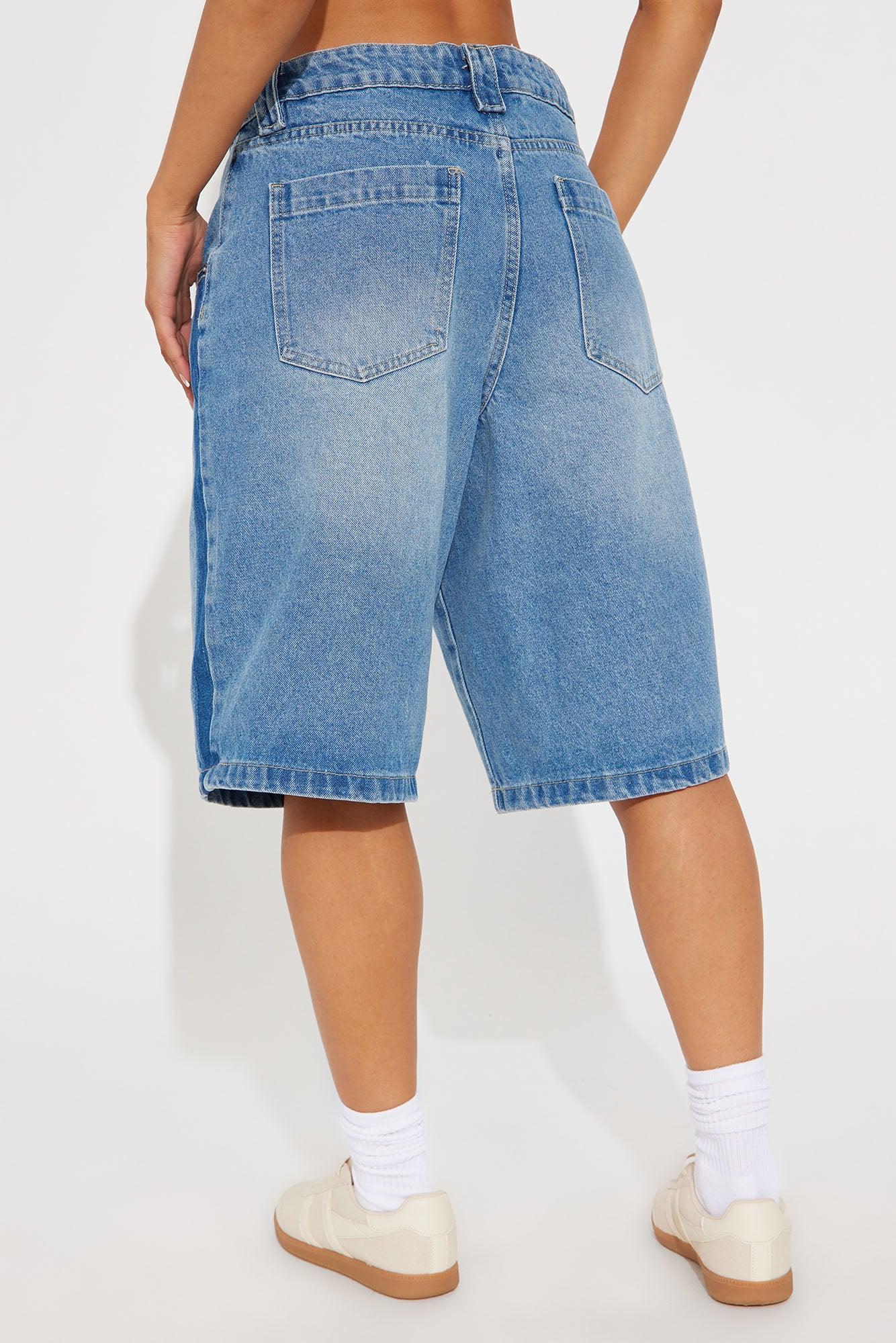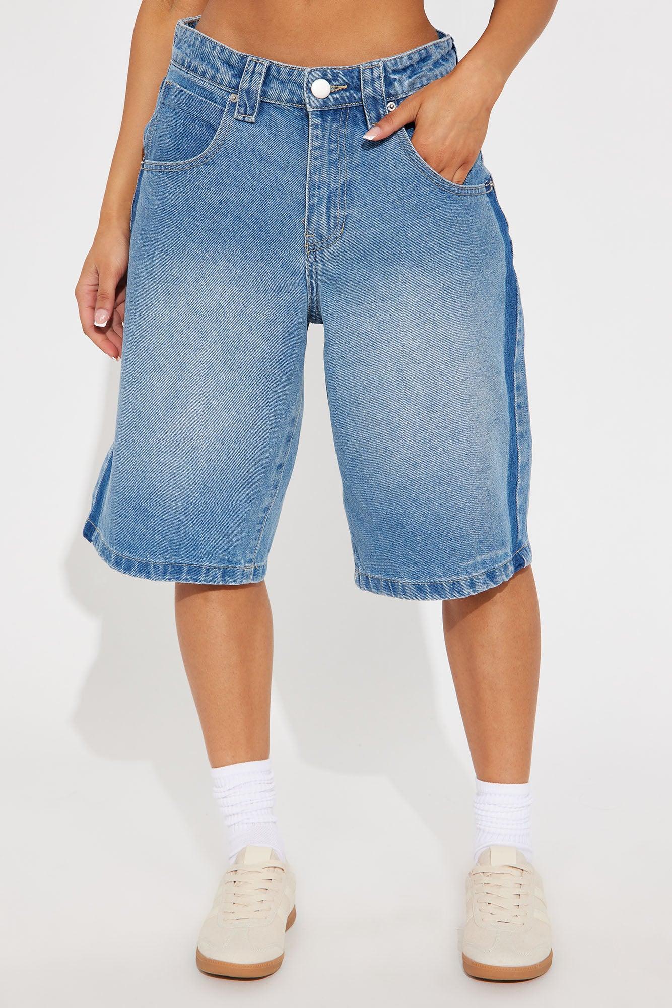 Available In Medium Wash. Denim Short 5 Pocket Stripe Detail 11" High Rise 12" Inseam Non Stretch Disclaimer: Due To The Specialized Wash, Each Garment Is Unique. 100% Cotton Imported California Proposition 65 WARNING: Cancer and Reproductive Harm - www.P65Warnings.ca.gov.