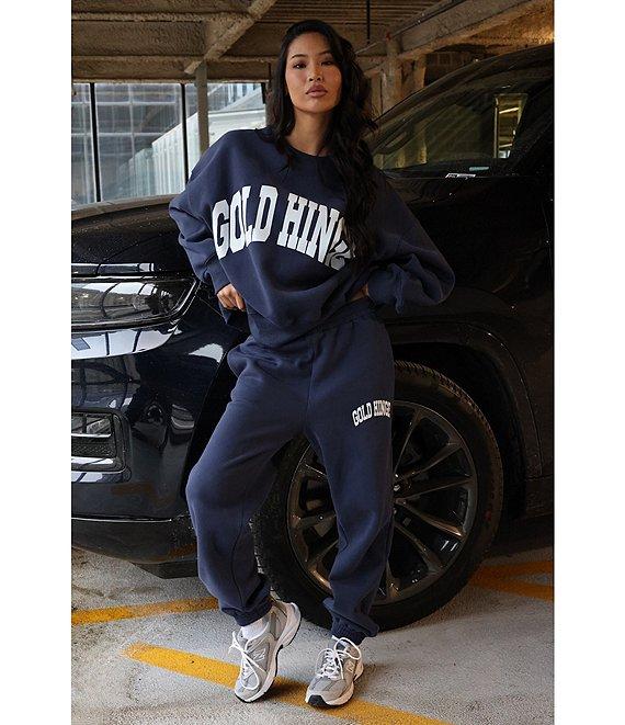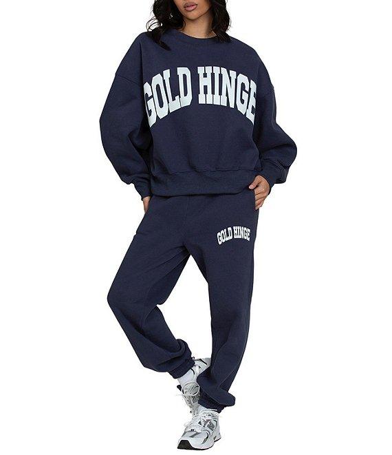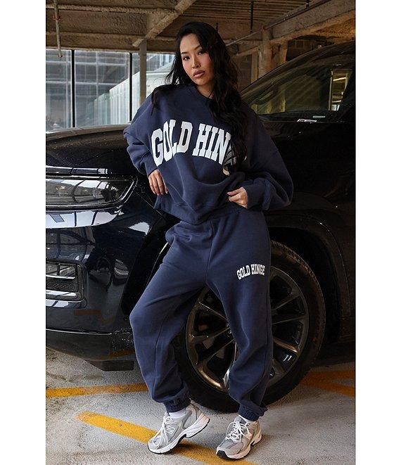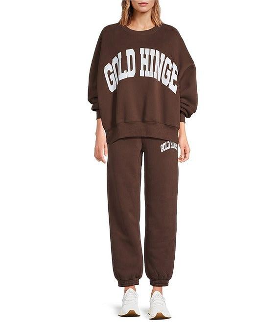 From GOLD HINGE, this sweatpants features: Fleece fabrication Heat press logo High waist Elastic waistband Side seam pocket Relaxed fit Cinched cuff hemline Pull-on construction Cotton/polyester blend Machine wash Imported.