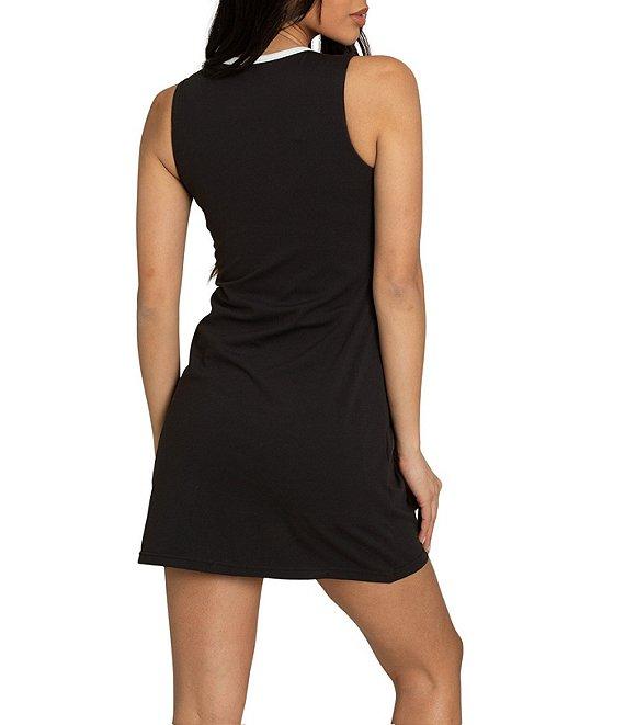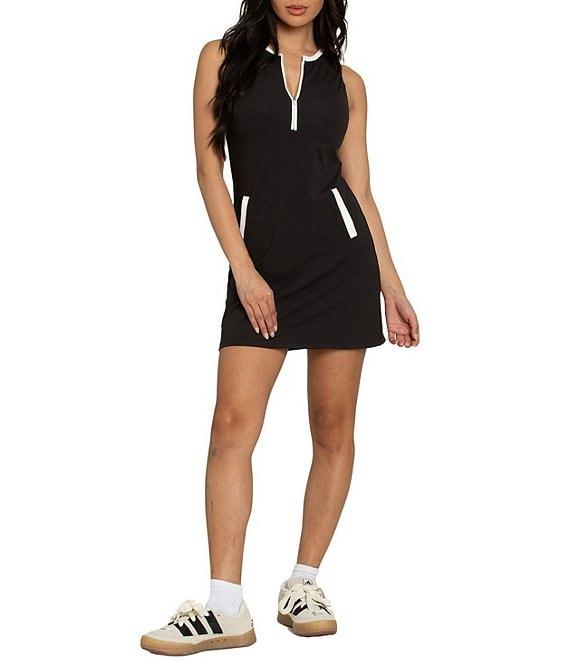From GOLD HINGE, this dress features: V-neckline Sleeveless Dual side front pockets Contrast trim Built-in spandex shorts Removable cups Half-zip closure Spandex Machine wash cold Imported.