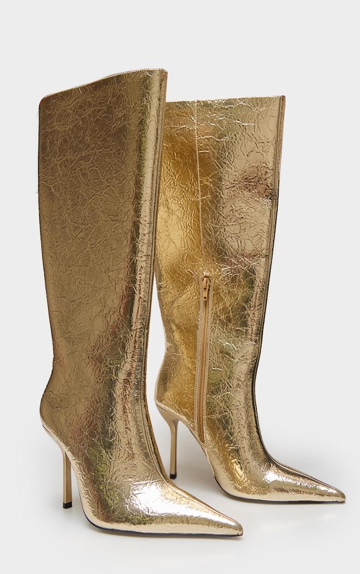 For an unmissable look, add these gold PU crinkle point toe knee high stiletto heeled boots to your basket. Brought to you in a chic gold PU crinkle material, with a point toe design and fierce high stiletto heels, these heeled boots are a must-have. Pair with your most confident outfit and you're set to go. PU Slip-on 4.5inch Heelp]:!mb-0inch>Category: FootwearProduct type: Heeled Knee High BootsColor: GoldOccasion: Day