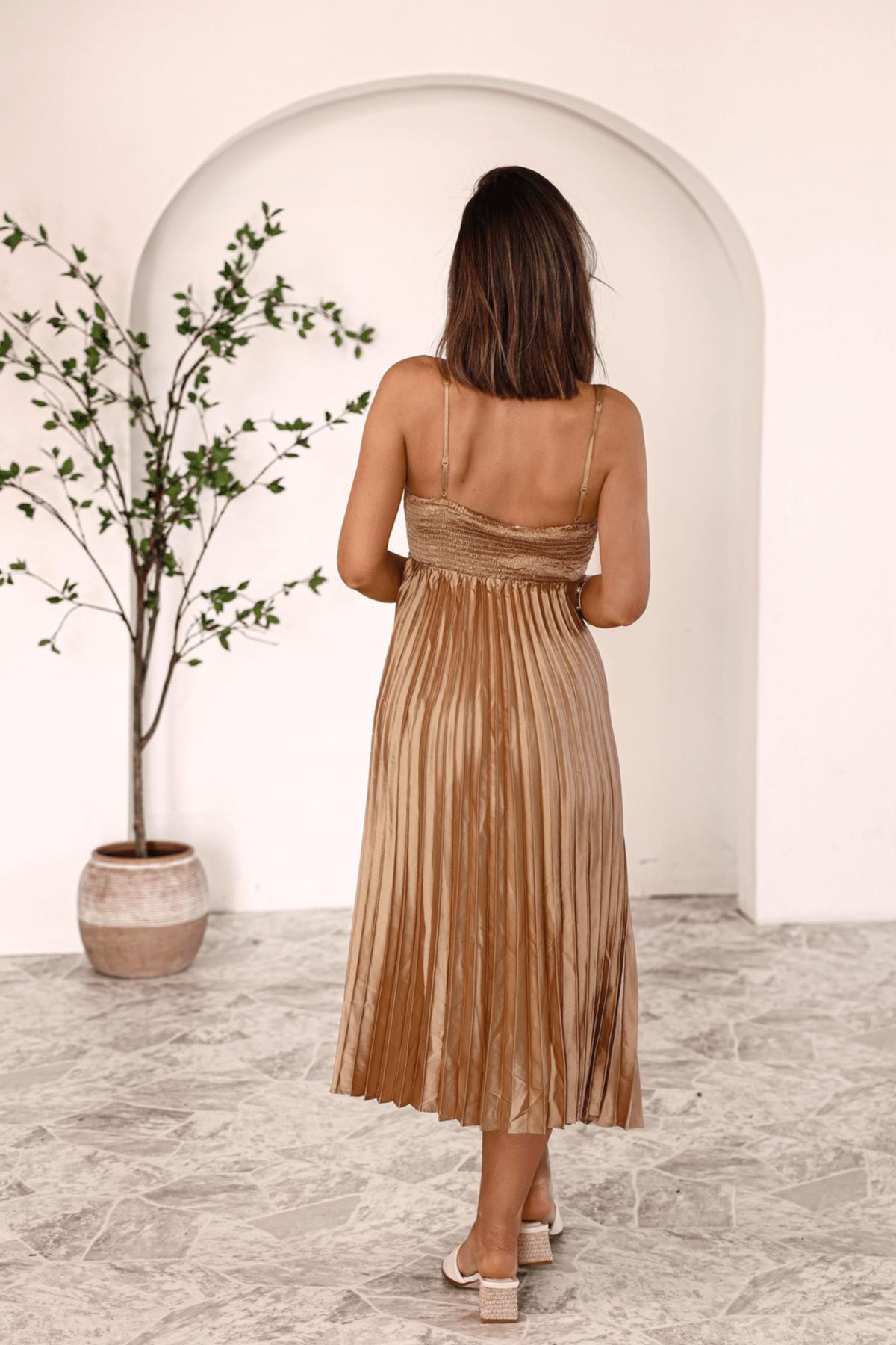 Our Gold Satin Pleated Midi Dress brings an elegant, radiant touch to any special occasion! With a flattering sweetheart neckline and pleated satin fabric, this dress creates a graceful silhouette that falls to a midi length. Adjustable straps provide a customized fit, while the smocked back ensures comfort and ease of movement. Made with a touch of stretch, the gold satin material shines beautifully, making this dress a glamorous choice for holiday gatherings, formal events, or celebratory nights out!