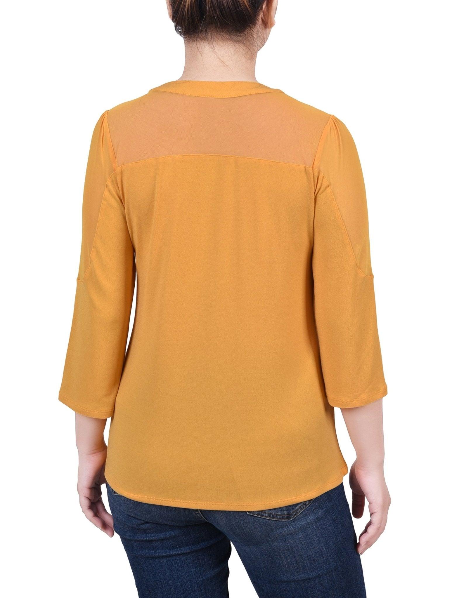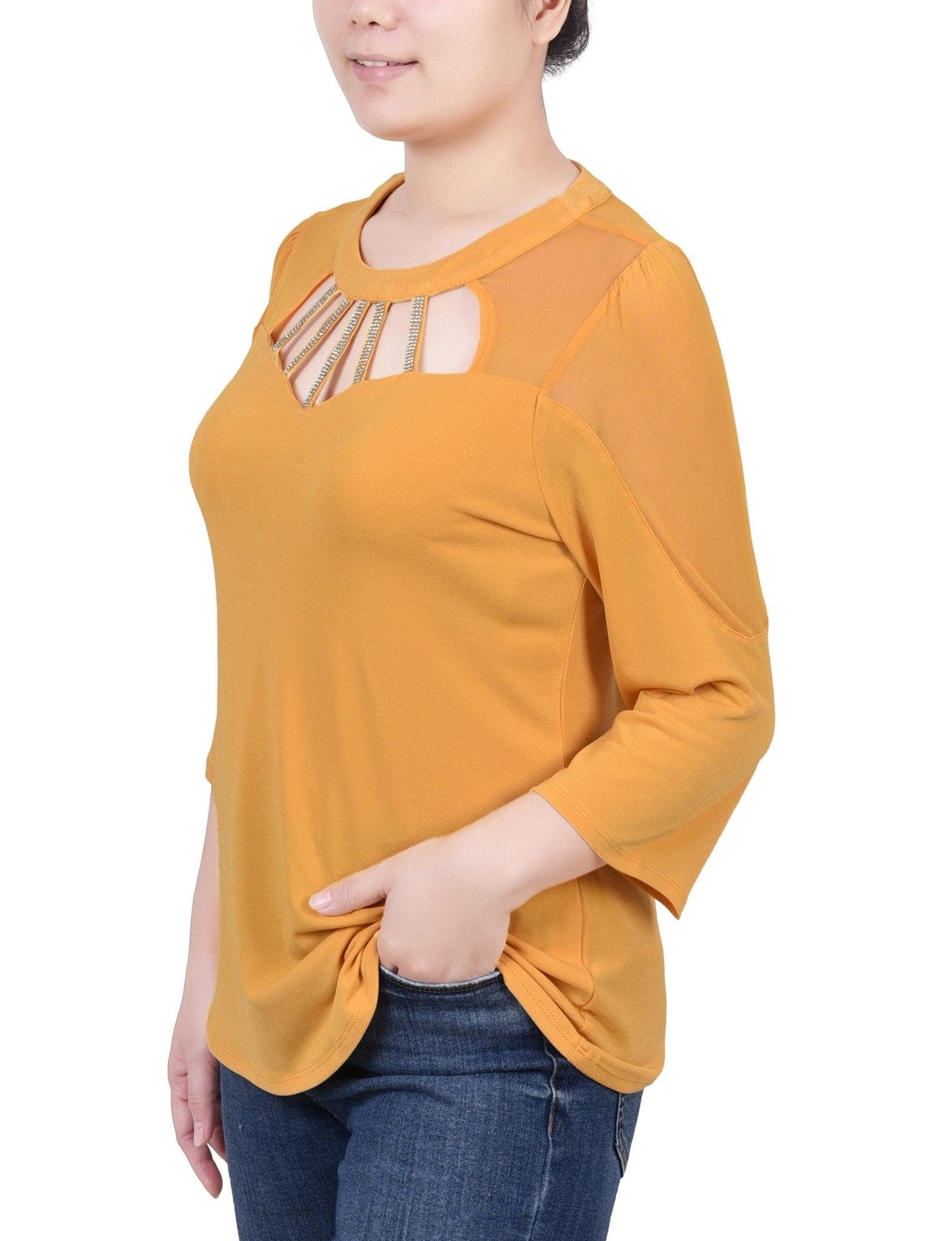 Golden Glow 3/4 Sleeve Top With Neckline Cutouts and Stones - Petite