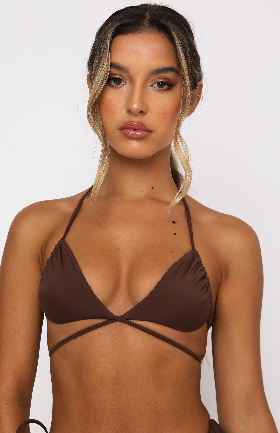 WHITE FOX SWIM Feel like a total beach hottie in the Golden Hour Bikini Top in Chocolate. This triangle bikini top is a halter neck style with thin elasticated straps and removable padding. This bikini top can be worn multiple ways. Finish the look with one of our Chocolate bikini bottoms. - 80% Nylon 20% Elastane- Model is a Size XS & is wearing a Size XS AS SEEN ON… @MIKAYLAMENIN, @SAVANNAHSHAERICH, @EMILYVENZ, @THELIFEOFLIBS @EWEBZZ @JESSHUNT2 & @GRACIEPISCOPO
