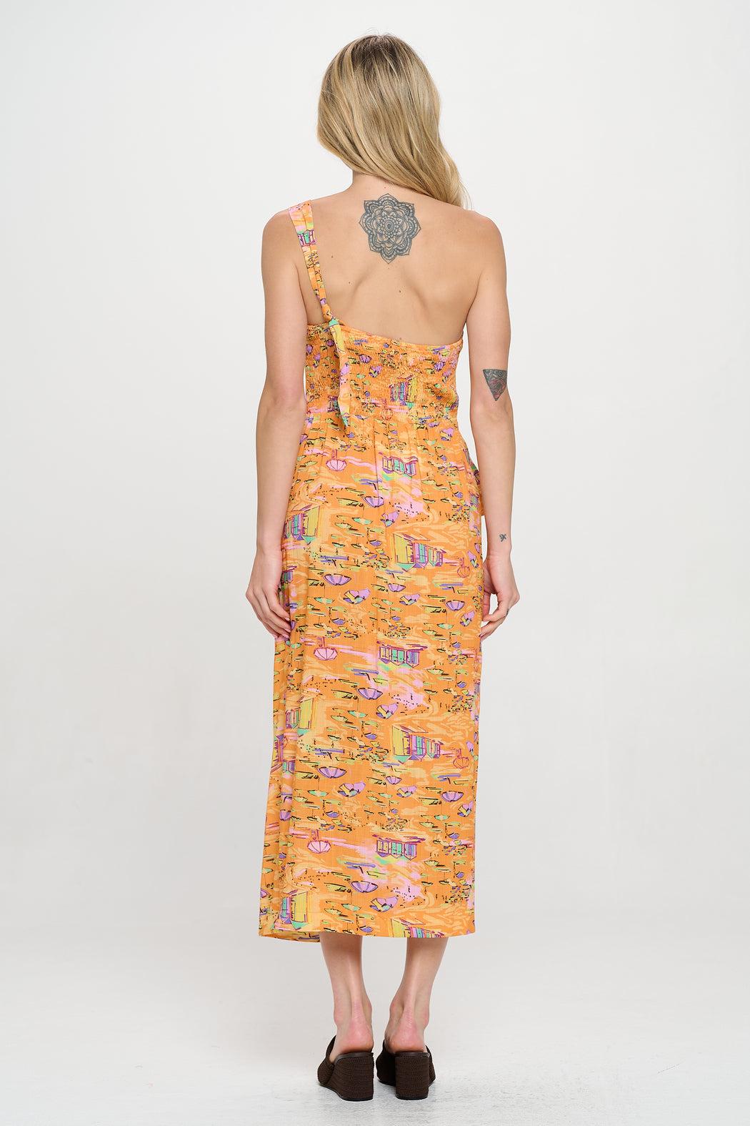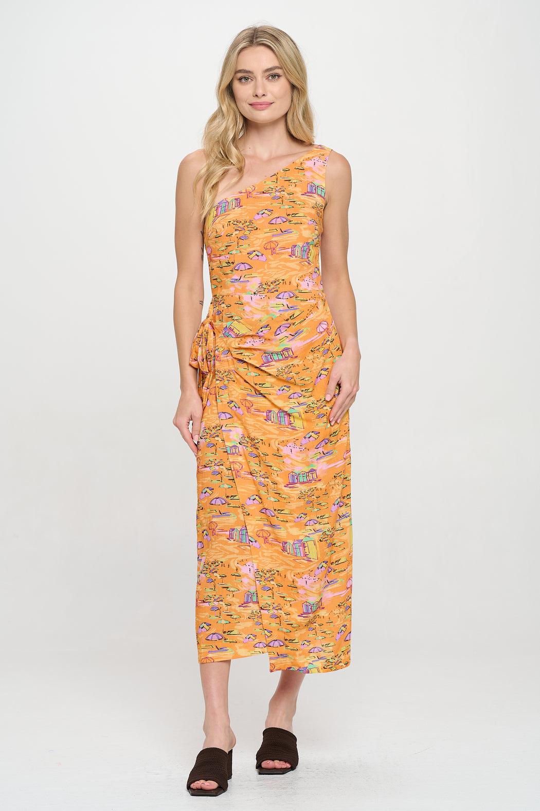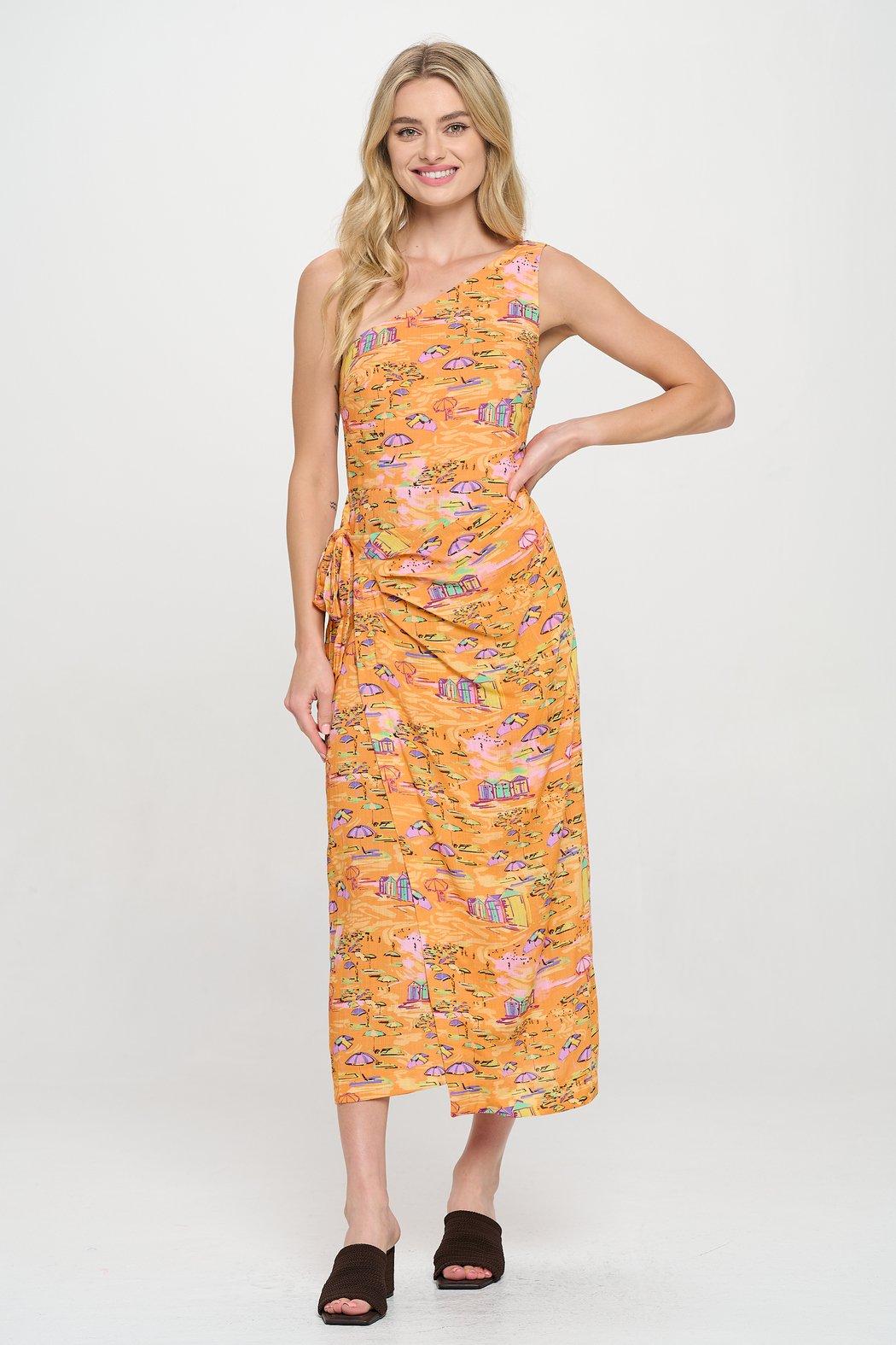 The Golden Shoreline One Shoulder Wrap Midi Dress transports you to a dreamy beachfront escape. Designed in a silky printed fabric inspired by vintage coastal postcards, this statement piece features a flattering one-shoulder neckline, a functional side tie detail, and a wrap-style midi silhouette that drapes with ease. The vibrant palette of warm oranges, pinks, and aqua tones mirrors a sunset view over island sands, making it the perfect dress for coastal getaways, vacation dinners, or warm-weather celebrations. Lightweight and eye-catching, this women’s resortwear standout radiates playful sophistication.