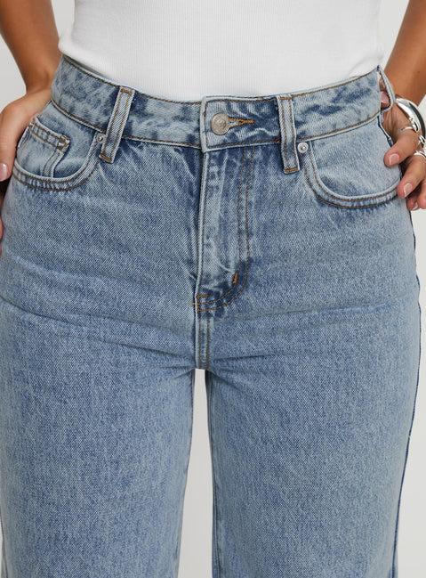 High-rise wide leg denim jeans Light washed, belt looped waist, button & zip closure, five pockets, branded patch at back Non-stretch material, unlined Princess Polly Lower Impact 50% organic cotton 50% reclaimed cotton Cold gentle machine wash