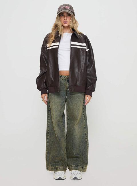 Bomber style, faux leather material, classic collar, exposed zip fastening, twin hip pockets, ribbed waistband and cuffs, oversized fitting