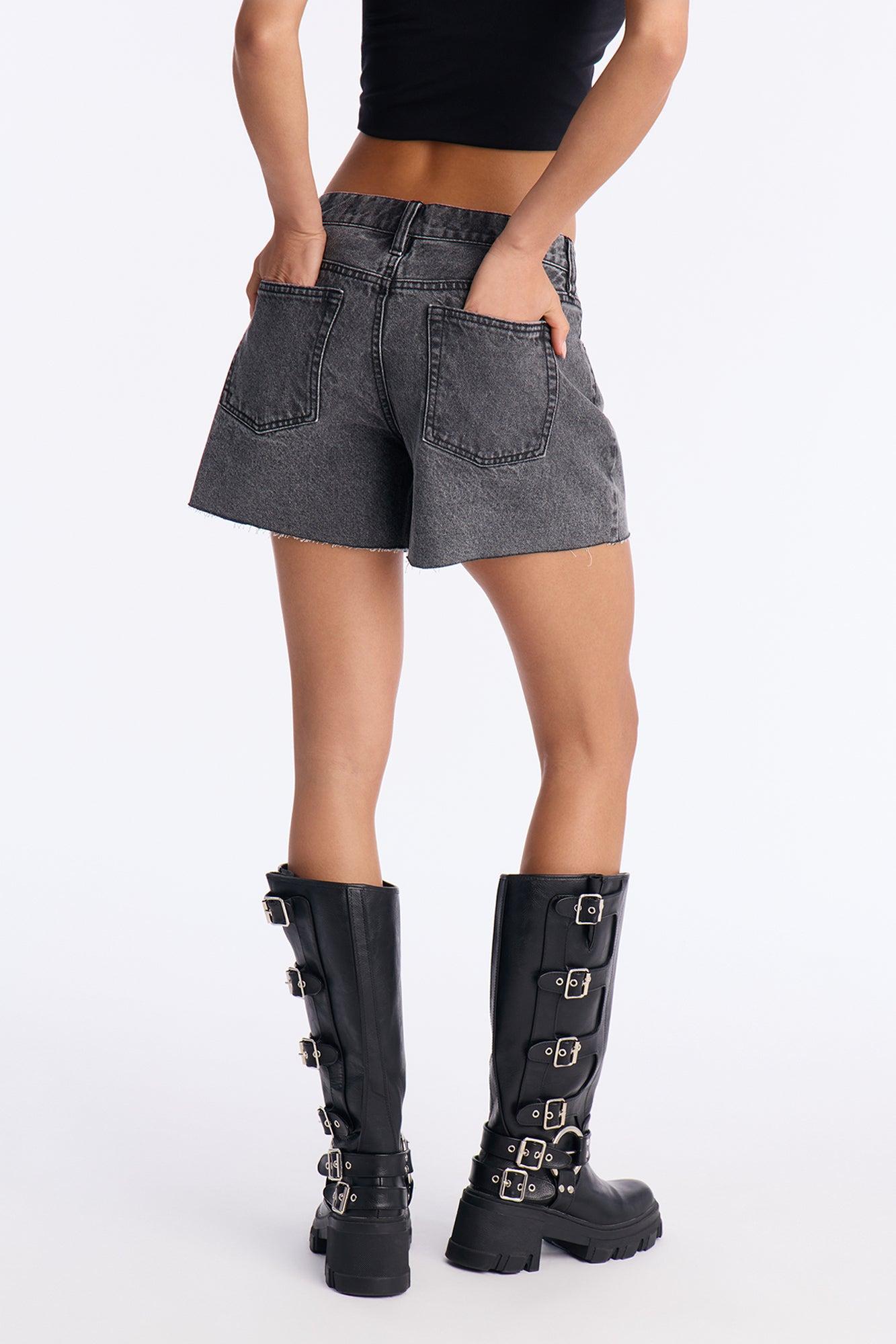 Available In Black Wash. Denim Short 5 Pocket Cut Off Fray Hem 10" Rise 4" Inseam Non Stretch Disclaimer: Due To The Specialized Wash, Each Garment Is Unique. 100% Cotton Imported California Proposition 65WARNING: Cancer and Reproductive Harm - www.P65Warnings.ca.gov.