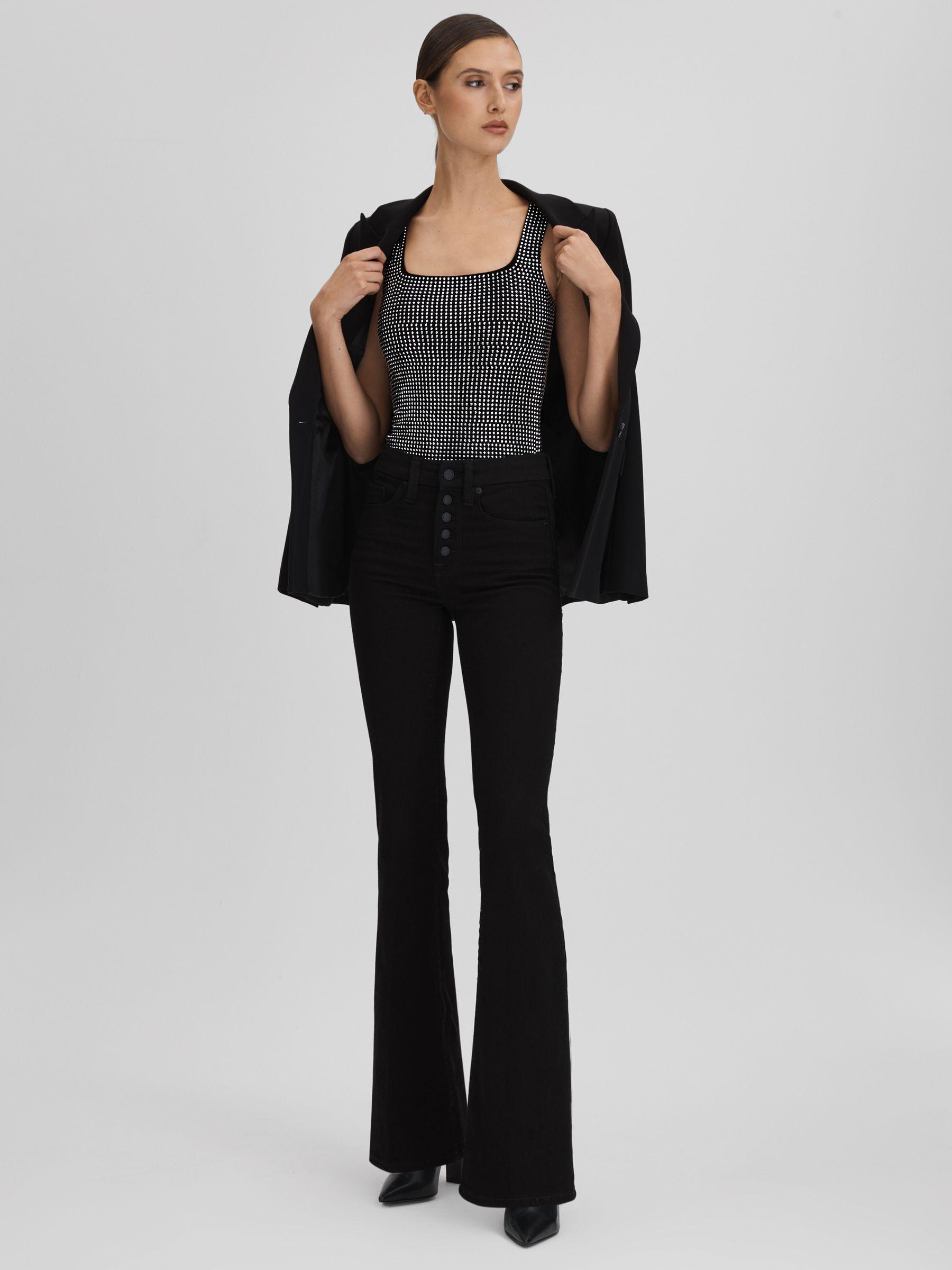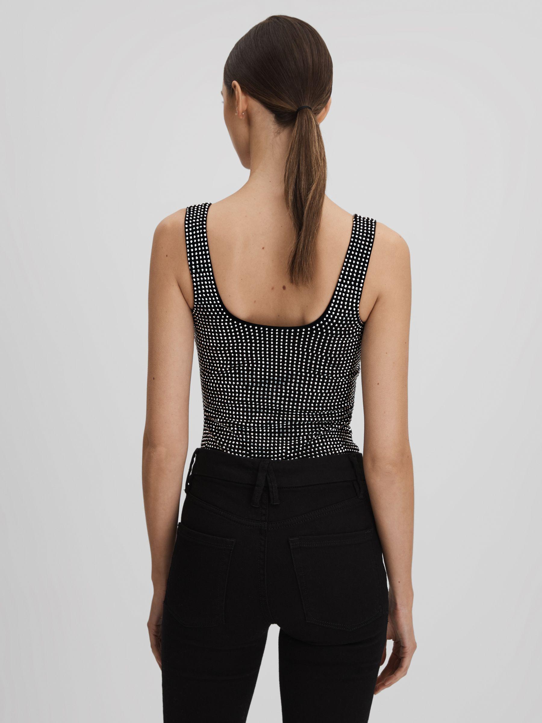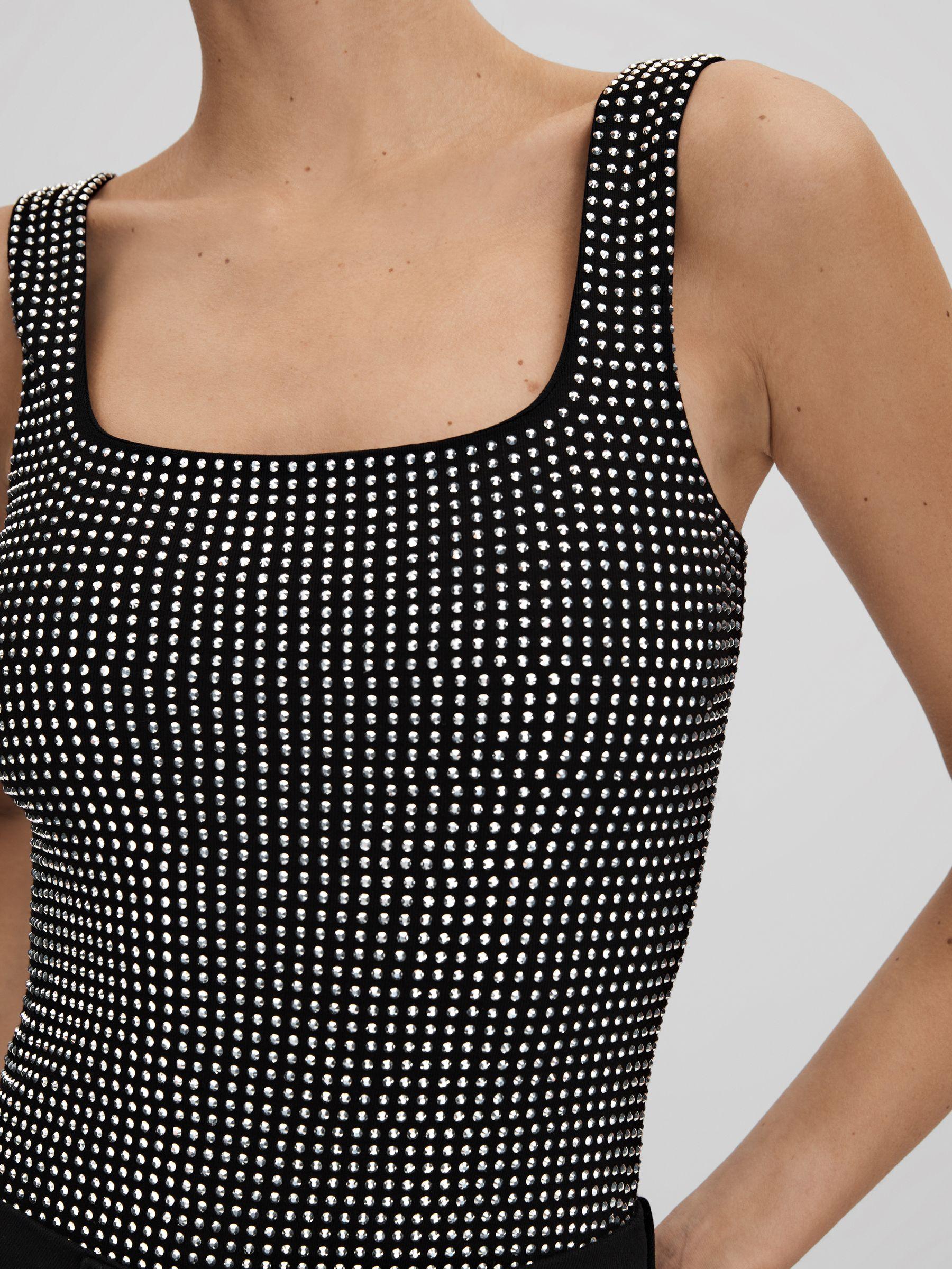 This thong bodysuit is crafted from an embellished, compressive fabrication which sculpts and smooths the frame for a flawless look beneath clothes. A modern square neckline flatters the chest, and wide shoulder straps offer comfort and support. High-stretch fabrication Embellished Square neckline Wide shoulder straps Thong-style back Press-stud gusset Good American, curated by Reiss, is a collection designed to work perfectly with your existing Reiss wardrobe. Innovative, solution-led denim and lifestyle garments champion inclusivity, enhance curves and represent body acceptance. By women, for women.
