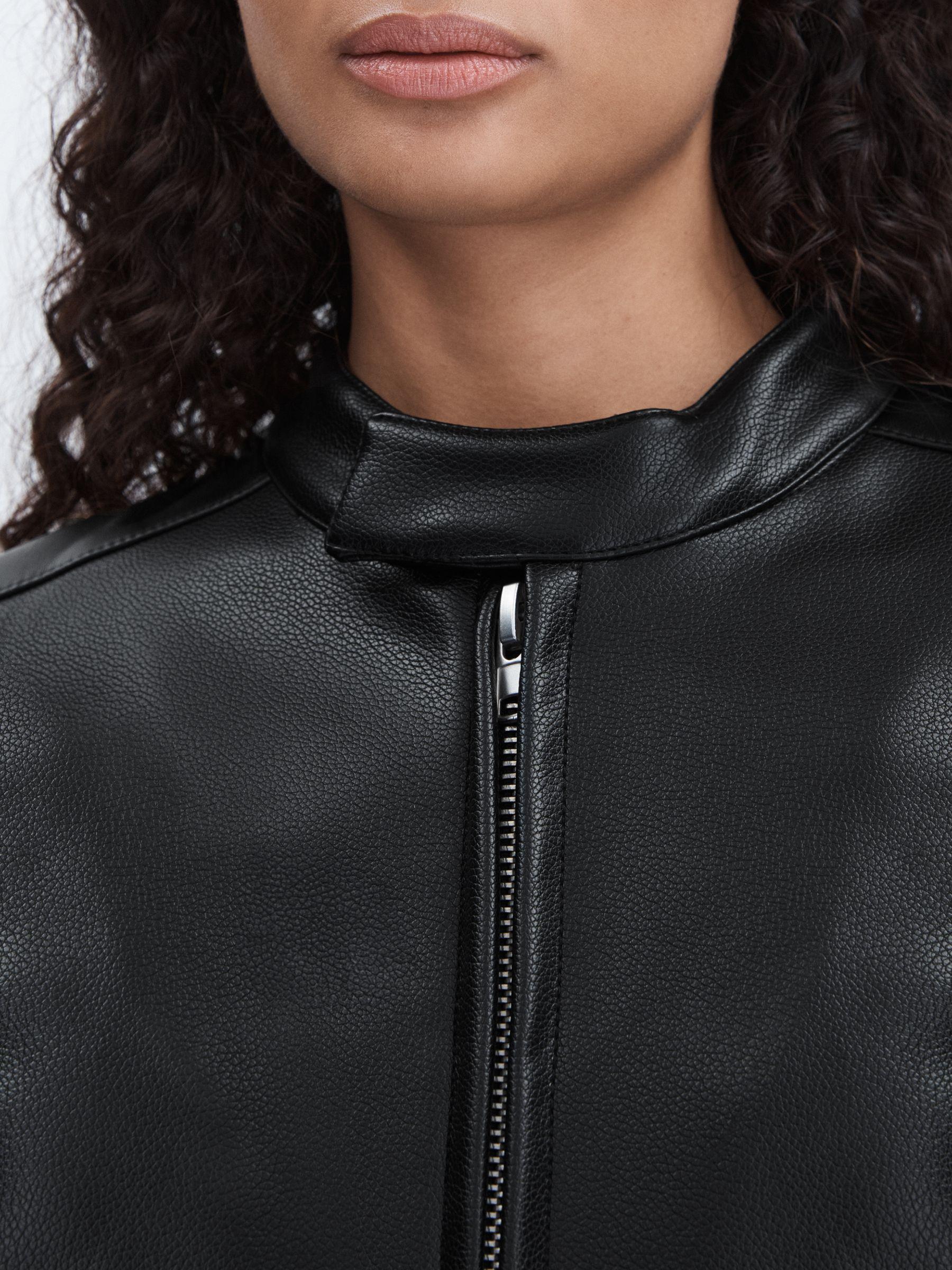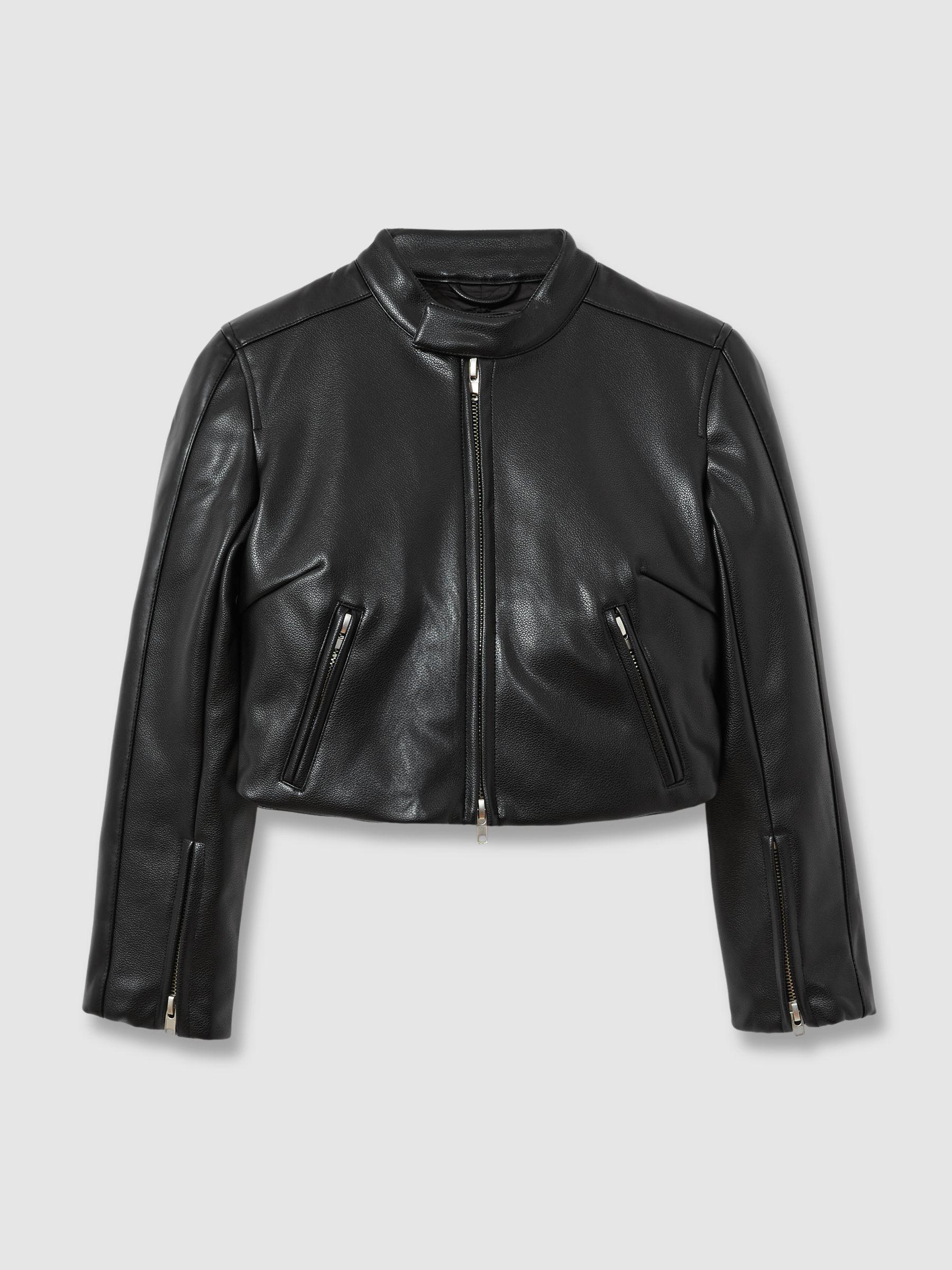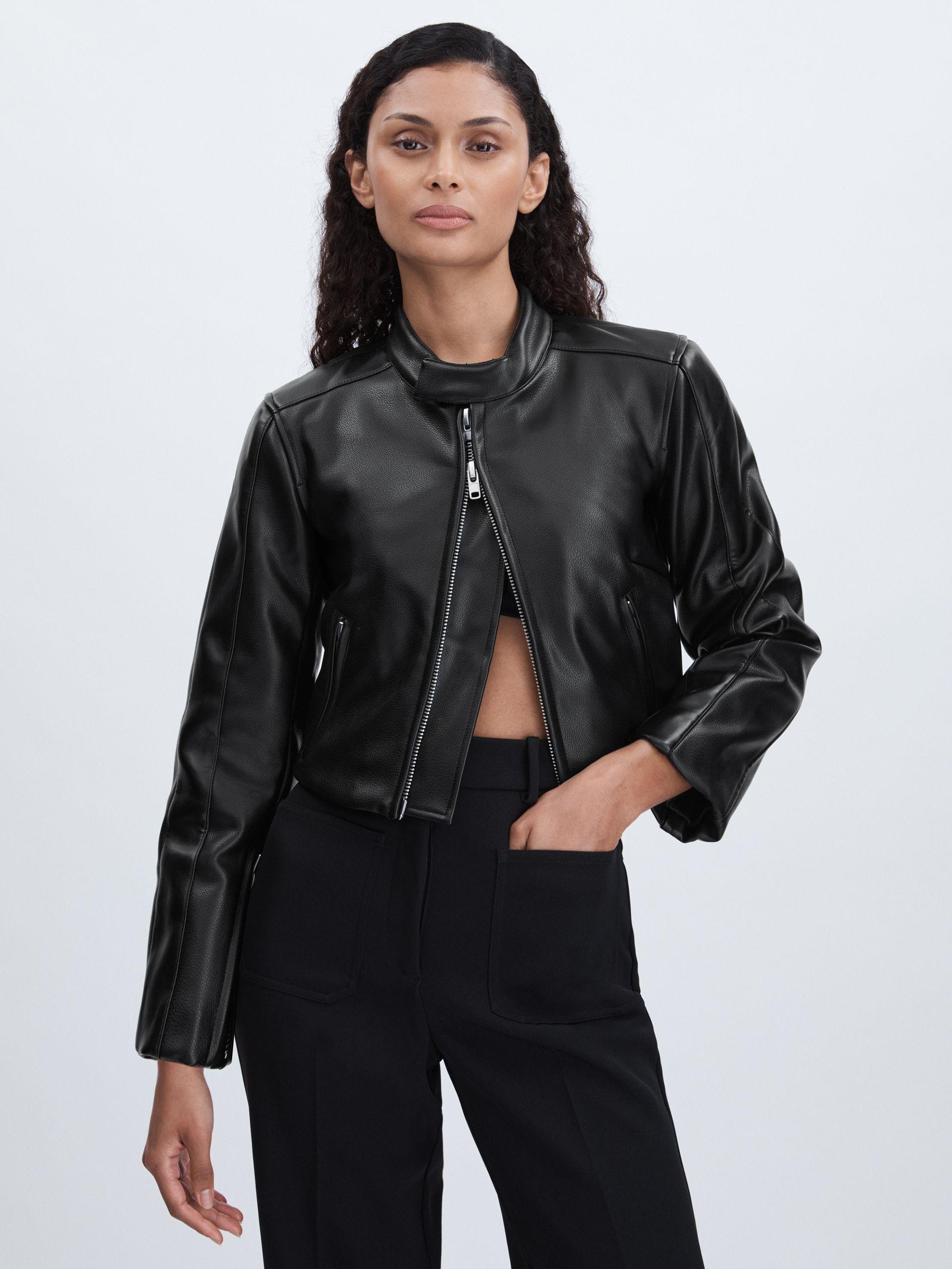The Good American Moto jacket takes its inspiration from the racetrack. The fitted style is crafted from faux leather with a subtle grain and is cut to a cropped length. Multiple zips in silver-tone hardware add to the tough edge. Faux leather with subtle grain Press-stud band collar Partially functional zip cuffs Size zip pockets Cropped Diamond-quilted lining Dual zip fastening Good American, curated by Reiss, is a collection designed to work perfectly with your existing Reiss wardrobe. Innovative, solution-led denim and lifestyle garments champion inclusivity, enhance curves and represent body acceptance. By women, for women.