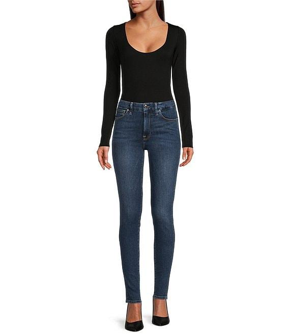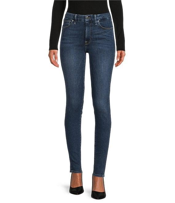 From Good American, these jeans feature: Stretch denim fabrication Skinny silhouette High rise gap-proof waistband Belt loops 5-pocket style Body hugging and booty shaping High recovery denim for all day support Button and zip fly closure Approx. 29" inseam; 10.5" front rise; 10" leg opening Cotton/polyester/elastane Machine wash/lay flat Imported.