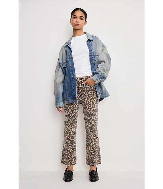 From Good American, these jeans feature: Comfort denim fabrication Leopard print High-rise Mini flare at hem Clean hem Super stretch Classic 5-pockets Front zip-fly closure Gap-proof waistband Reinforced belt loops Tummy smoothing technology Approx. 27.5” Cotton, Recycled Cotton, Polyester, Elastane Hand wash. Do not bleach. Hang or lay flat to dry. Do not dry clean. Imported.