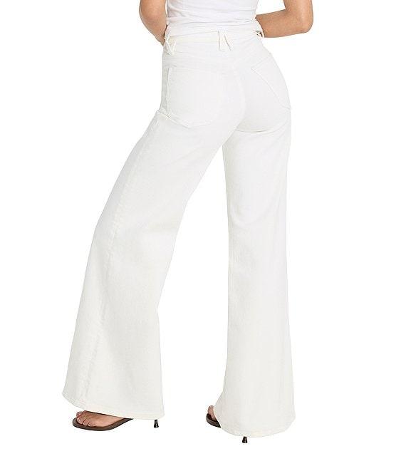 From Good American, these jeans feature: Denim fabrication High-rise waistline Front button/zipper fly Classic 5 pocket styling Palazzo wide leg silhouette Approx. 33.5" inseam, 26" leg opening, 11" rise BCI cotton/recycled cotton/T-400/Repreve/elastane Machine wash, dry flat Imported.