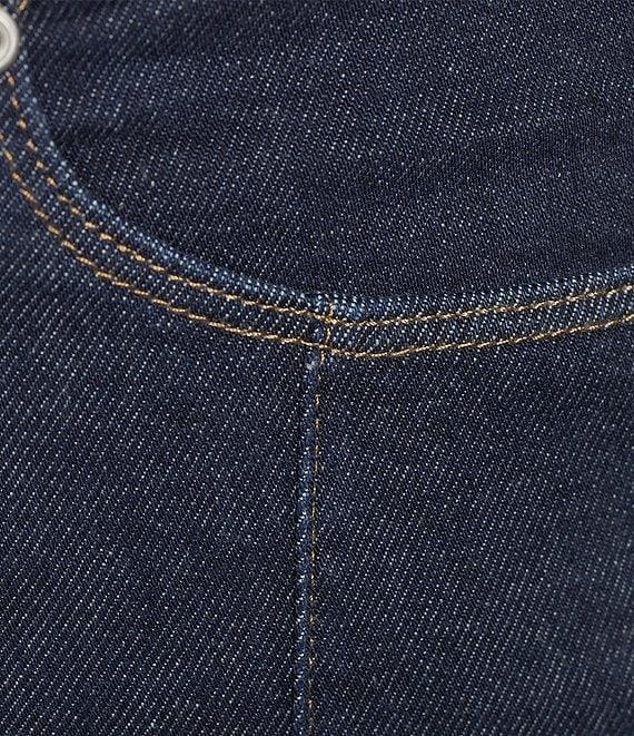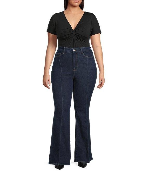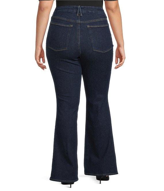 From Good American Plus, these jeans feature: Stretch denim fabrication Dark blue wash Mid-rise waist Gap-proof waistband Seaming at front Front zip-fly closure Classic 5-pocket silhouette Mini flare at hem Clean hem Reinforced belt loops Approx. 33.5" inseam Cotton, Elastomultiester, Elastane Wash inside out in cold water/ Tumble dry Imported.