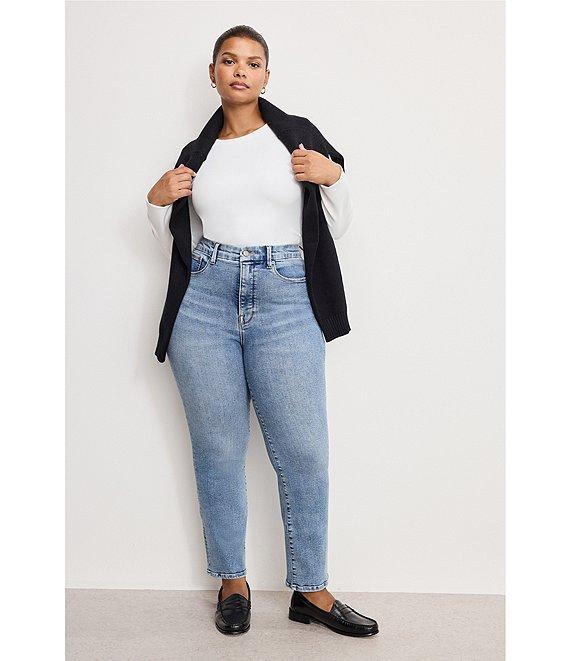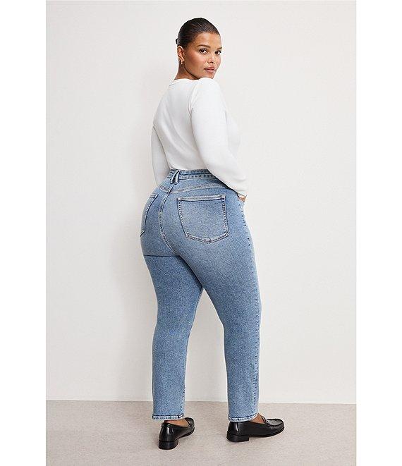 From Good American Plus, these jeans feature: Denim power stretch fabrication Mid-rise waistline Slim-straight silhouette Button front/ zipper fly closure Classic 5 pocket styling Gap-proof waistband Body hugging and shaping Full length Approx. 27" inseam, 14.5" leg opening, 10.25" rise Cotton/elastomultiestre/elastane Machine wash inside out/tumble dry Imported.