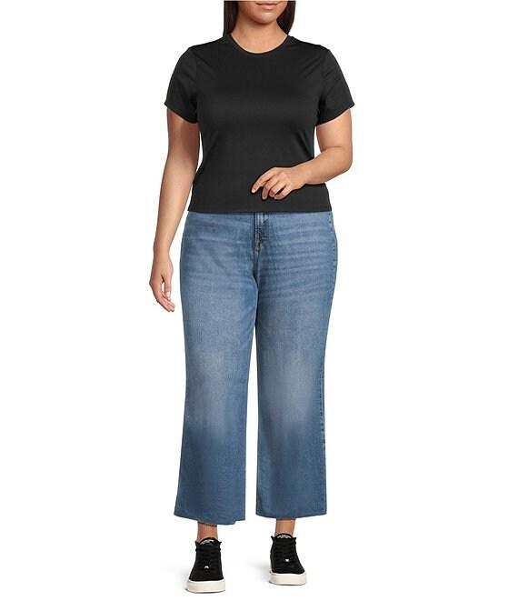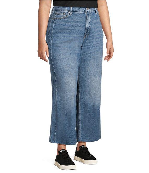 From Good American Plus, these jeans feature: Power stretch denim fabrication Medium blue wash High-rise waistline Relaxed legs Grinded hem Cropped fit Front zip-fly closure Classic 5-pockets silhouette Gap-proof waistband Reinforced belt loops Tummy smoothing technology Approx. 28" Inseam Cotton, Tencel, T400, Elastane Wash inside out in cold water, Tumble dry on low Imported.