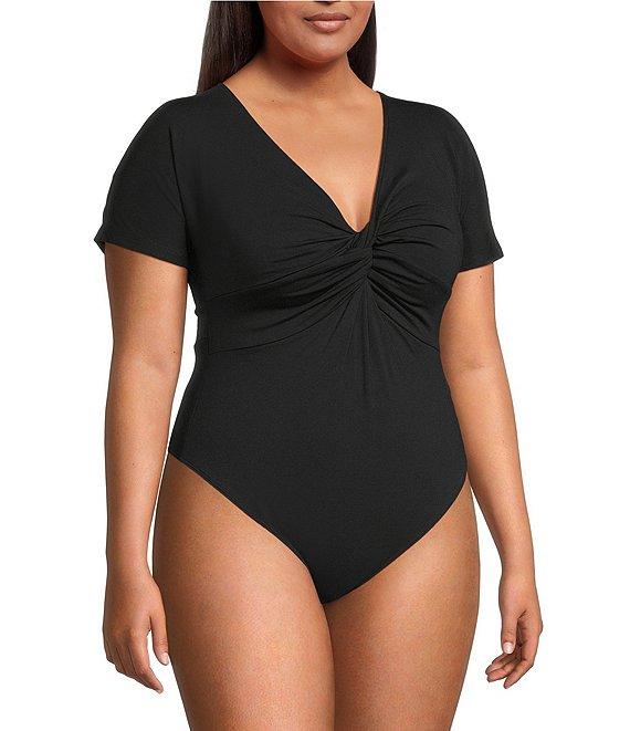 From Good American Plus, this bodysuit features: Jersey knit fabrication V-neckline Short sleeves Twist front detail Thong coverage Rayon/elastane Machine wash Imported.