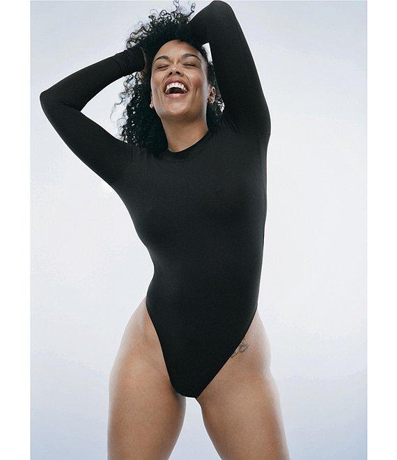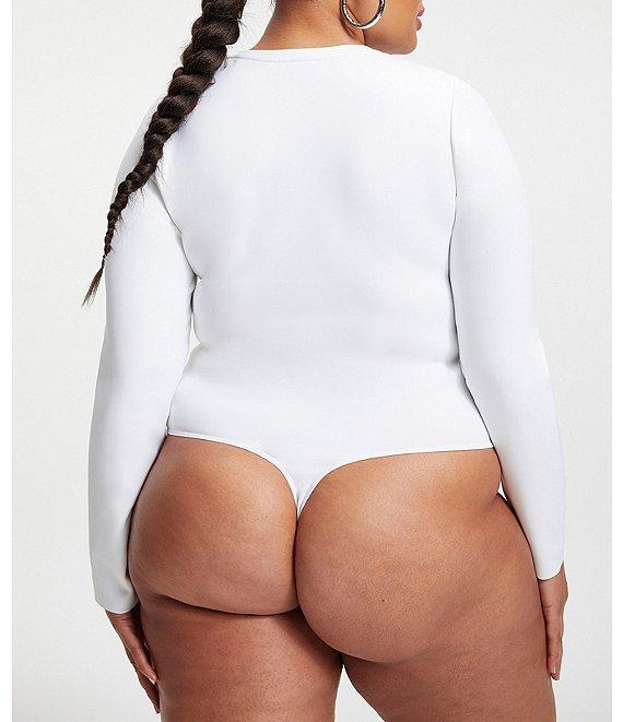 From Good American Plus, this bodysuit features: Scuba knit fabrication Crew neckline Long sleeves Thong bottom Bottom snap closure Nylon/elastane Dry clean or hand wash Imported.