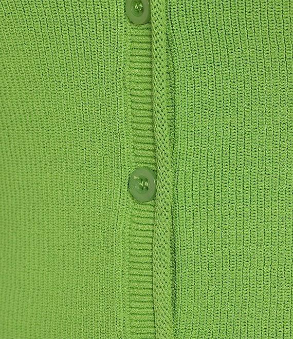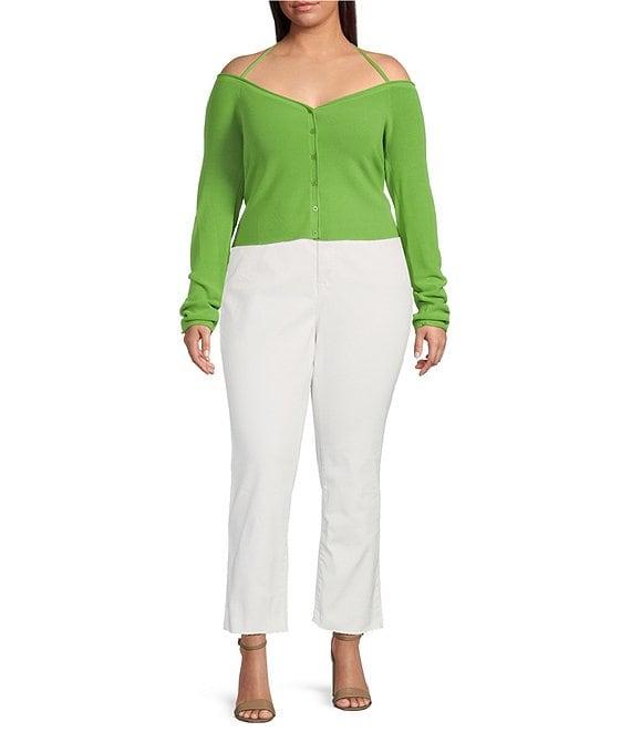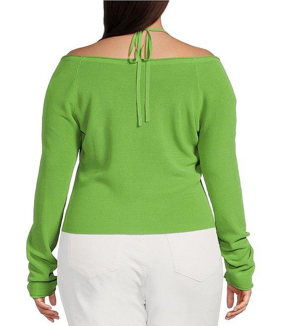 From Good American Plus, this top features: Stretch rib knit fabrication V-neckline Off-the-shoulder neckline Long sleeve Front button closure Halter neck tie detail Approx. 16" length Nylon/rayon Machine wash Imported.