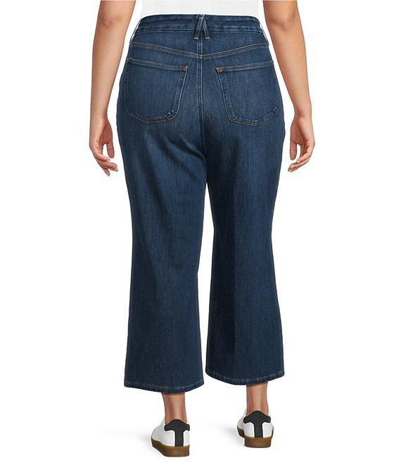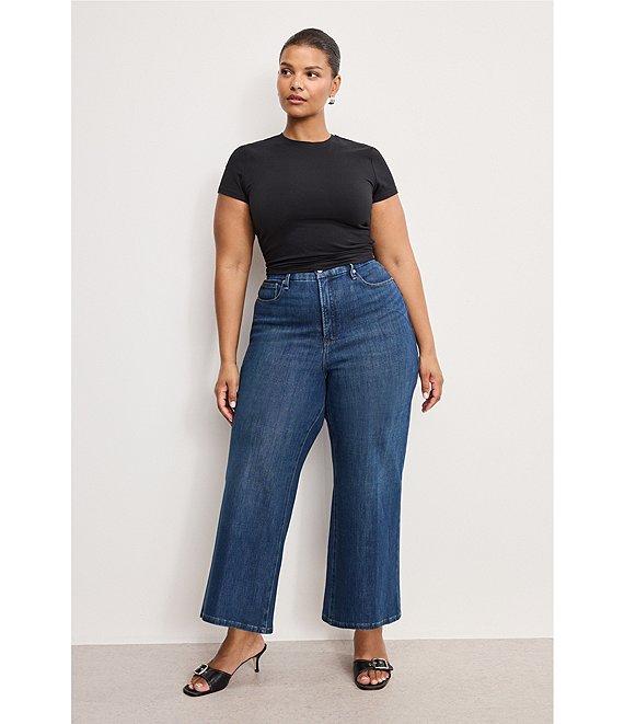 From Good American Plus, these jeans feature: Soft tech cotton fabrication High-rise waistline Wide palazzo leg silhouette Button front, zipper fly closure Classic 5-pocket styling Cropped length Approx. 26.5" inseam, 22" leg opening, 10.75 rise Cotton/polyester/rayon/spandex Machine wash cold/ tumble dry Imported.