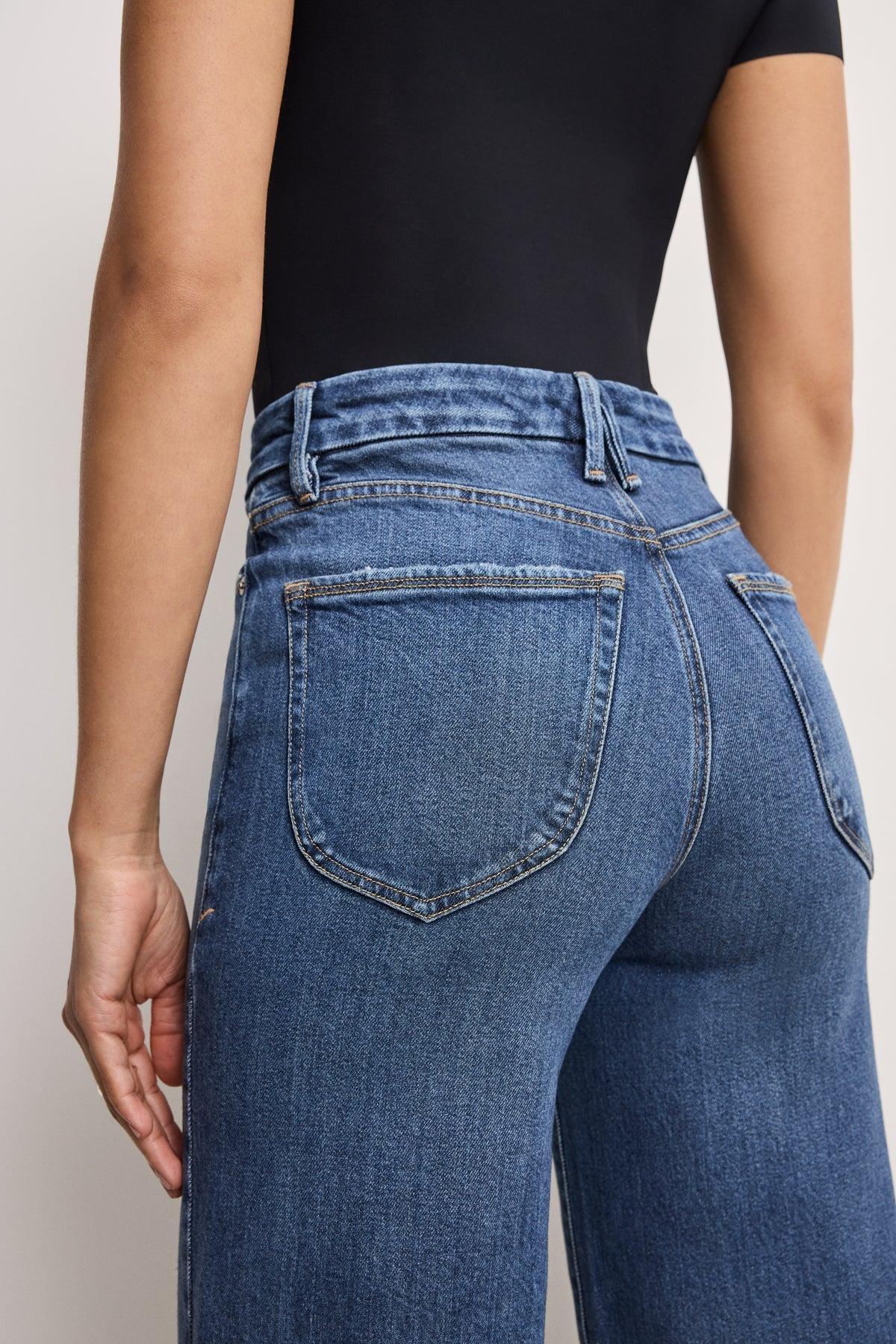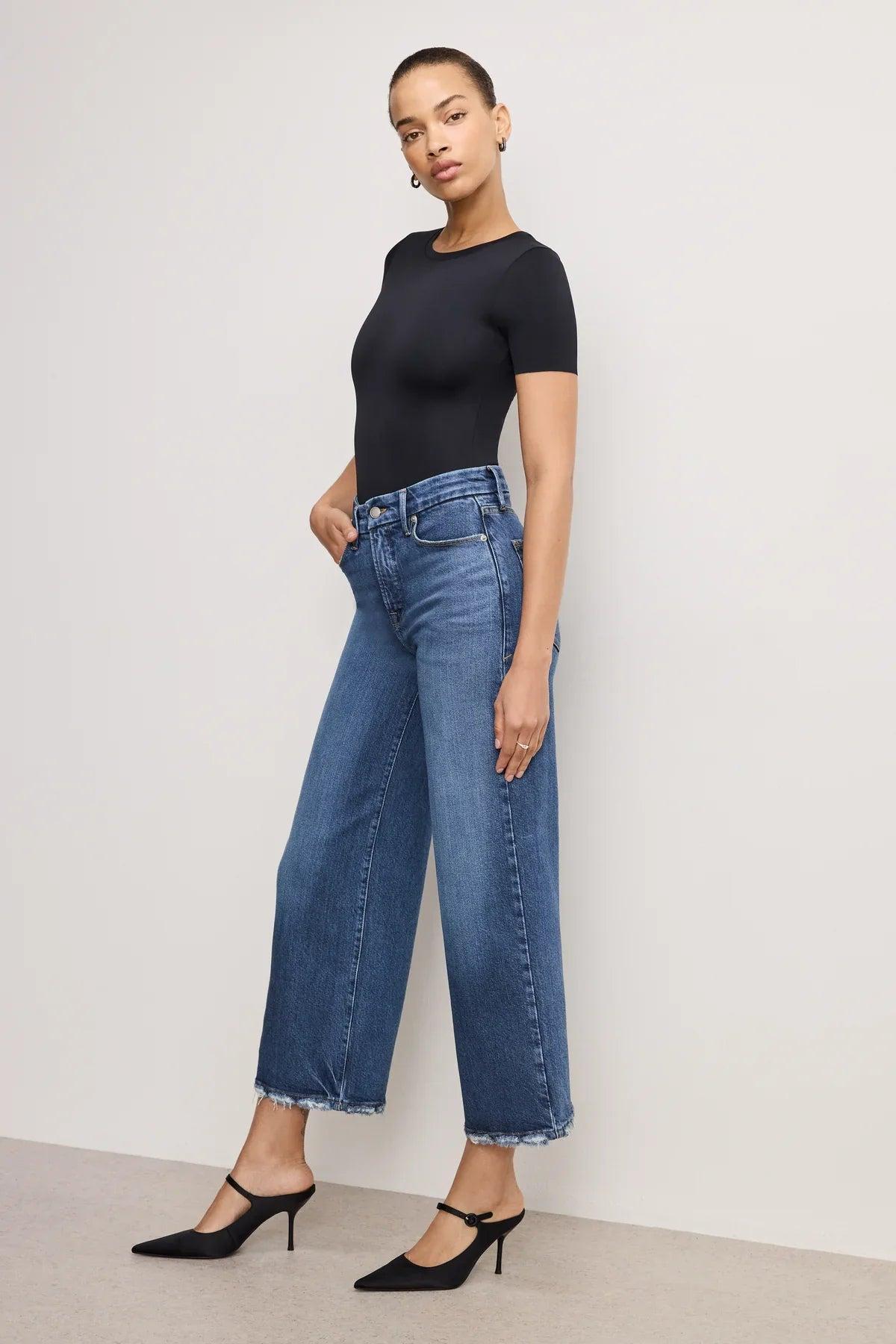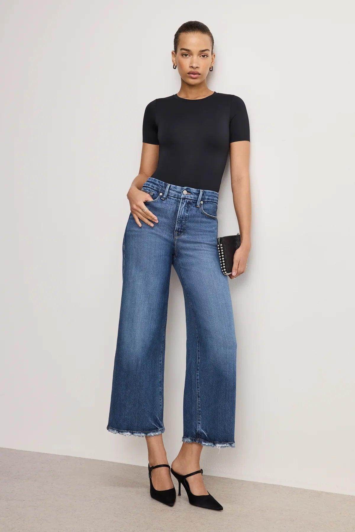 Experience effortless style and comfort of the Good American Soft-Tech Good Waist Cropped Palazzo Jeans in color Indigo737. The high-rise and wide loose legs are designed to enhance your natural silhouette. Made with SoftTech Denim, a luxurious, soft cotton that will make you feel like you're wearing a second skin.