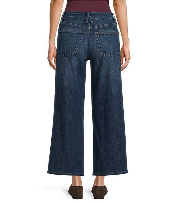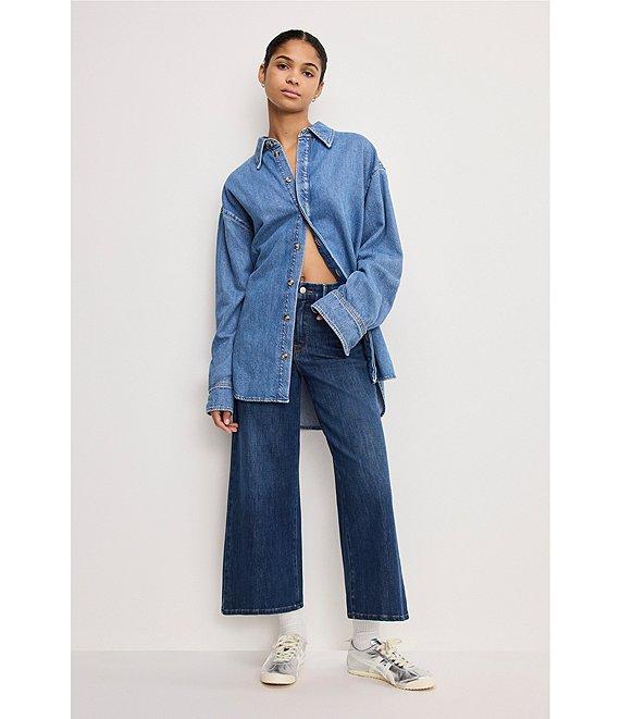 From Good American, these jeans feature: Soft tech cotton fabrication High-rise waistline Wide palazzo leg silhouette Button front, zipper fly closure Classic 5-pocket styling Cropped length Approx. 26.5" inseam, 22" leg opening, 10.75 rise Cotton/polyester/rayon/spandex Machine wash cold/ tumble dry Imported.