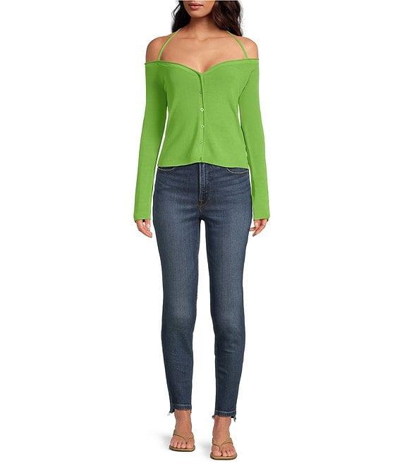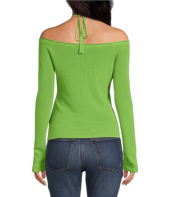 From Good American, this top features:Stretch rib knit fabricationV-neckline Off-the-shoulder neckline Long sleeveFront button closure Halter neck tie detail Approx. 16" length Nylon/rayon Machine wash Imported.