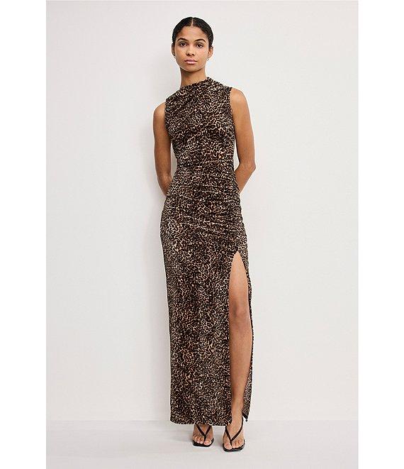 From Good American, this dress features: Velvet fabrication Leopard print High neckline Sleeveless Hidden side zipper closure Bodycon silhouette Side ruching detail Front leg slit detail Maxi length Approx. 59" length Polyester/elastane Machine wash/line dry Imported.