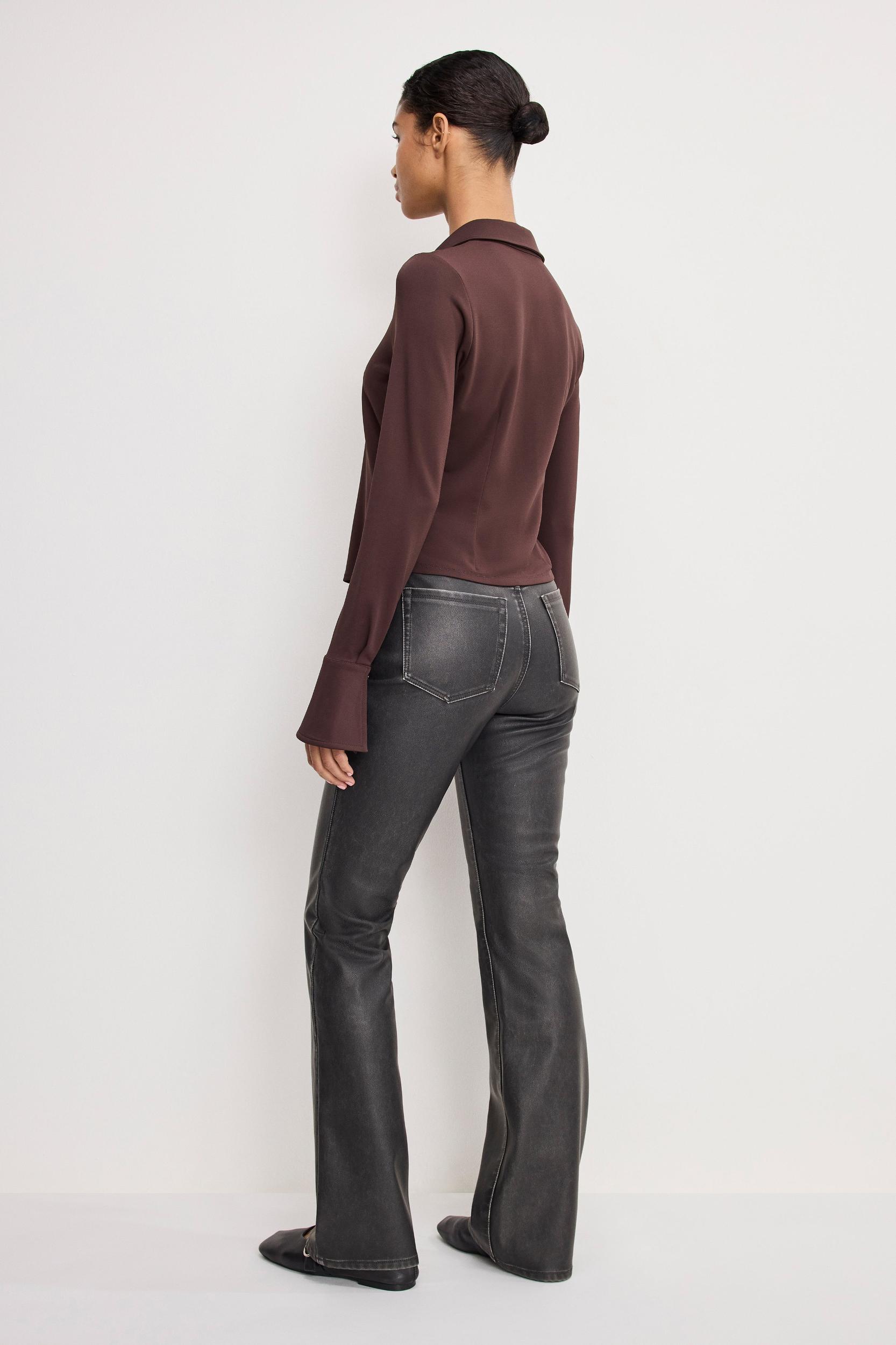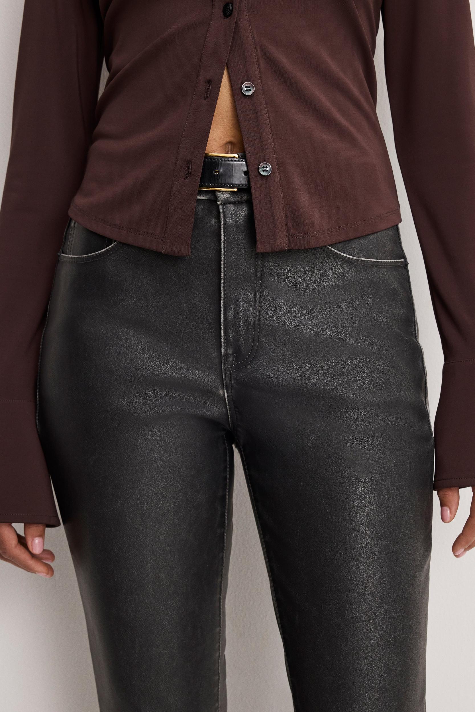Timeless meets bold. The Good Classic Bootcut Faux Leather Pants feature a high rise, slim fit through the hips, and a subtle bootcut leg for that long-line silhouette. Crafted from smooth faux leather with a soft sheen, they blend classic tailoring with a sleek, modern edge. Effortlessly refined—with just the right amount of attitude. - High-rise - Bootcut legs - Front zip-fly closure - Classic 5-pockets - Gap-proof waistband - Reinforced belt loops - Faux leather - Vintage wash effect detail at seams - Clean hem - Inseam: 33.5" Model is size 0, 5’9” and wearing size 0. Fabric: 100% Polyurethane (Back), 100% Polyester (Front) Care: Dry clean.