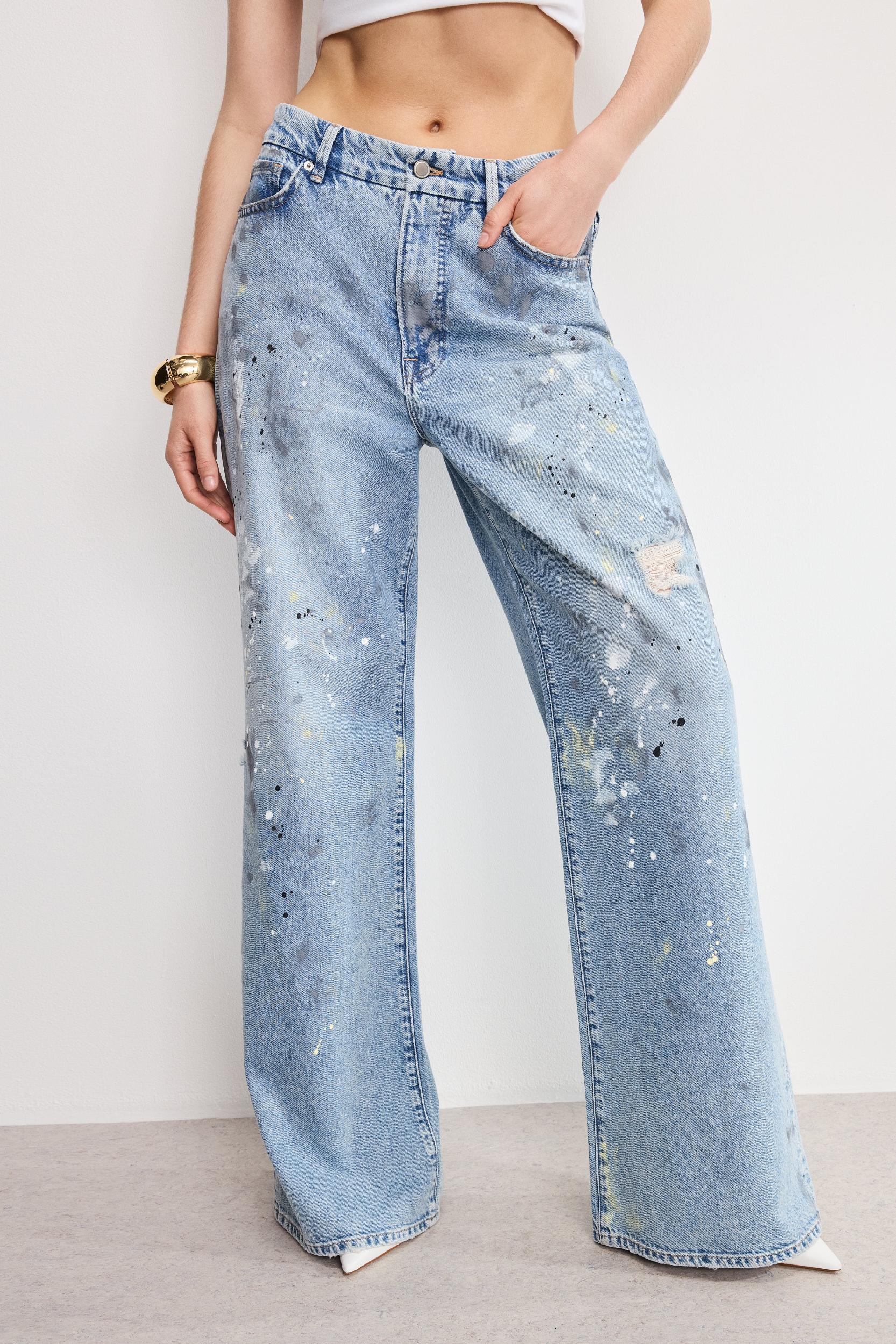 The ultimate lounge-around jeans, featuring a mid-rise waist and wide relaxed legs for effortless style and maximum comfort. Designed for a woman with a straighter body, this jean features a straight fit through the hips and thighs, a mid-rise, relaxed wide legs, and a slightly dropped crotch for a bold yet laid-back vibe. Crafted from premium rigid denim, they offer an authentic look and feel that molds to your body over time. Durable and timeless, these jeans are designed to break in beautifully, becoming uniquely yours with every wear. Mid-rise Relaxed legs Clean hem Paint splatter details Rigid denim Classic 5-pockets Front zip-fly closure Reinforced belt loops Medium blue wash Inseam: 34" Model size is 5’8 and wearing size 0 Model size is 5’9 and wearing size 0 Fabric: 82% Cotton, 18% Cotton Lyocell Care: Wash inside out in cold water with like colors. Do not bleach. Tumble dry on low. Iron on medium heat. Do not dry clean.