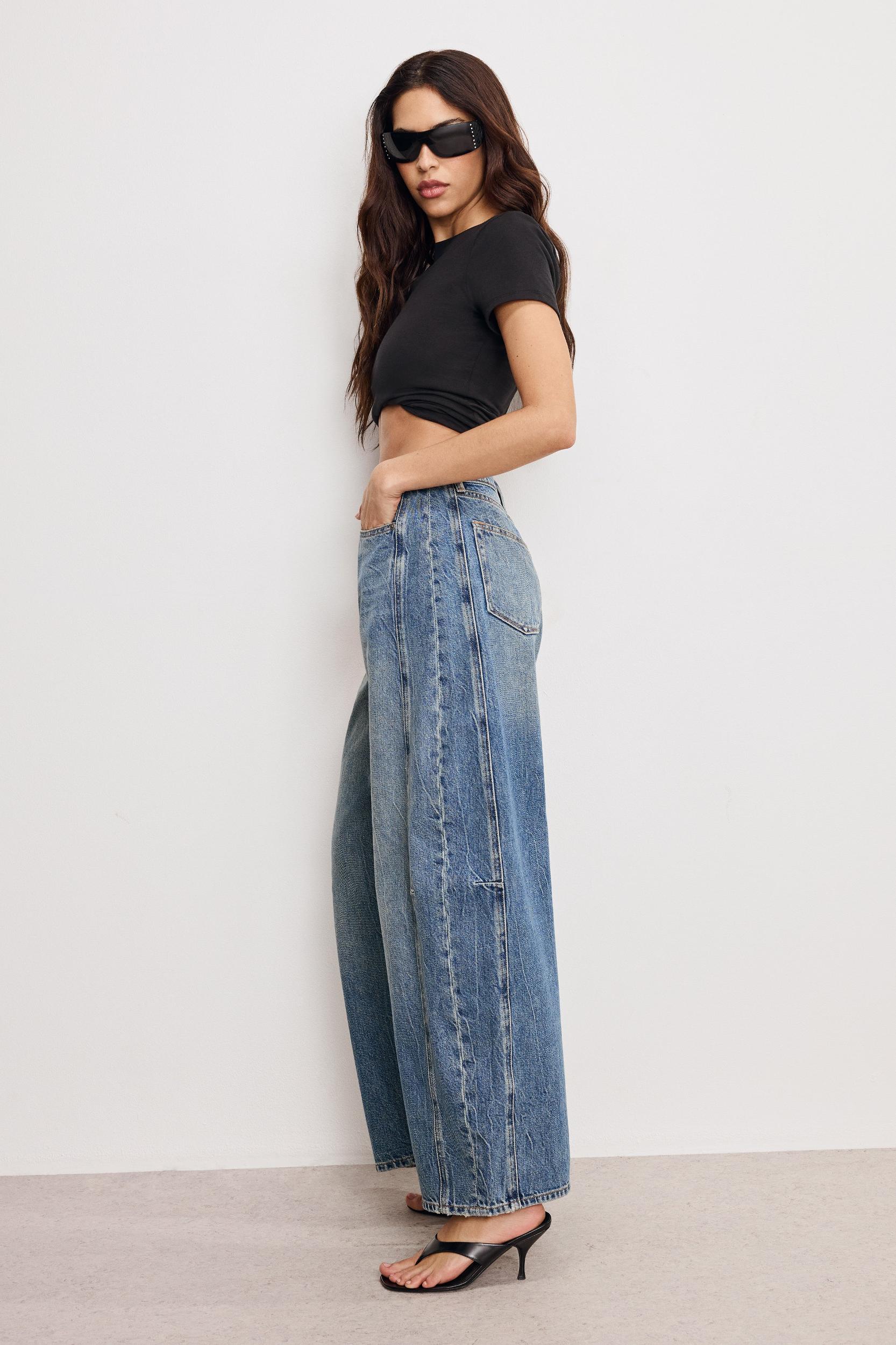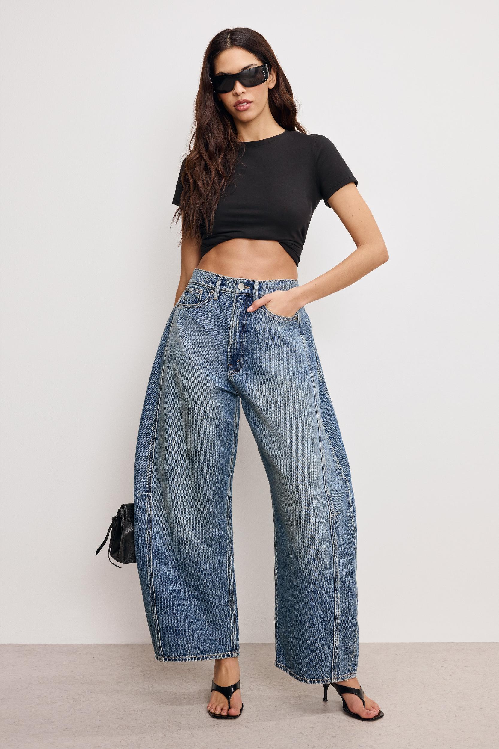 Elevate your closet with the Good Extreme Barrel Relaxed Jeans. With a high-rise waistline, extremely curved legs, and a loose fit, these statement jeans are the ultimate blend of bold style and modern flair. Featuring an internal drawstring for cinching the waist, they create a flattering silhouette while the legs dramatically extend out to form a distinctive horseshoe curve, adding an extra fashion-forward touch. Crafted from premium rigid denim, they offer an authentic look and feel that molds to your body over time. Durable and timeless, these jeans are designed to break in beautifully, becoming uniquely yours with every wear. We recommend sizing down. High-rise Relaxed with extremely curved legs Clean hem Rip detailing Rigid denim Classic 5-pockets Front zip-fly closure, with internal drawstring Gap-proof waistband Reinforced belt loops Tummy smoothing technology Medium blue wash Inseam: 27.5” Model size is 5'8 and wearing size 0 Fabric: 75% Regenerative Cotton, 25% Recycled Cotton Care: Wash inside out in cold water with like colors. Do not bleach. Tumble dry on low. Iron on low heat. Do not dry clean.