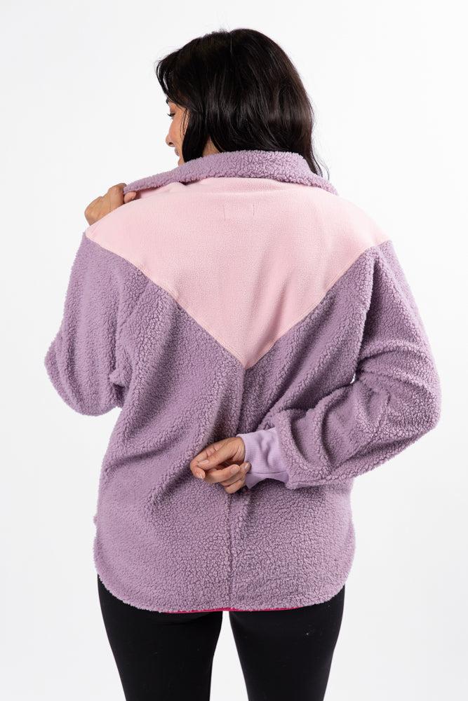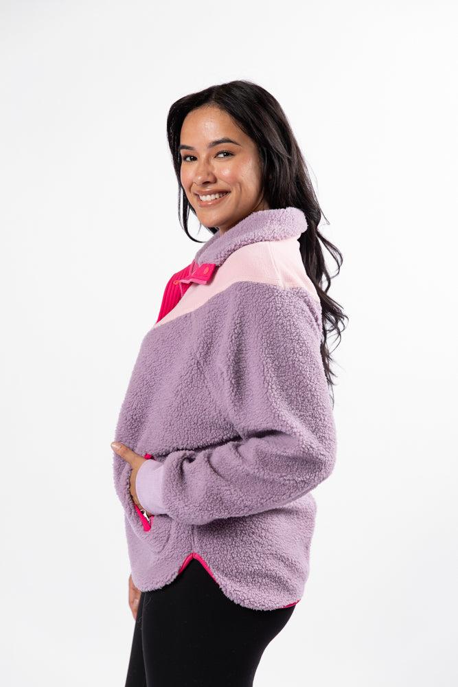 Details Purple Multi Colorblock Sherpa Pullover Fabric has some stretch Collared style, functional button up and zipper closure, zippered pockets Pair this pullover with a cute pair of leggings! Unlined Size small from shoulder to hem: 25.5" Material and Care 100% polyester Machine wash cold, tumble dry low Patterns may vary Materials may have natural variations Colors may vary from different viewing devices.