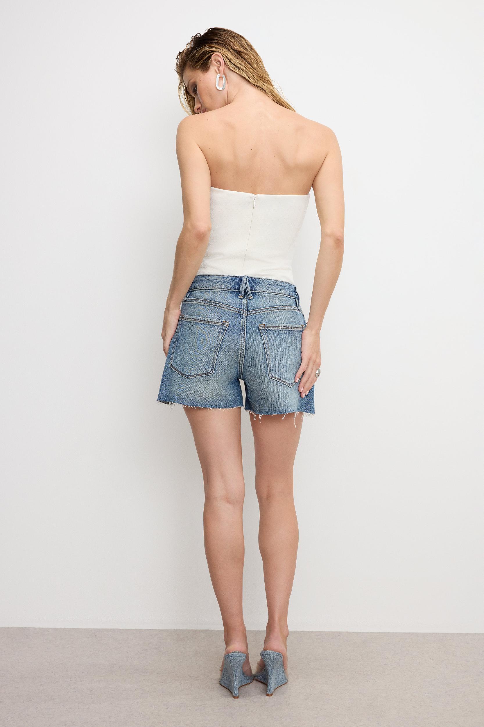 Our Good Girlfriend Shorts are essential for every wardrobe, with an ultra-flattering mid-rise waistline and a lightly grinded hem. Mid-rise Crossover front zip-and-button closure Classic 5-pockets Reinforced belt loops Gap-proof waistband Reinforced belt loops Tummy smoothing technology Medium light blue wash Inseam: 3.5" Fabric: 81% Cotton, 1% Elastane, 18% Cotton Lyocell