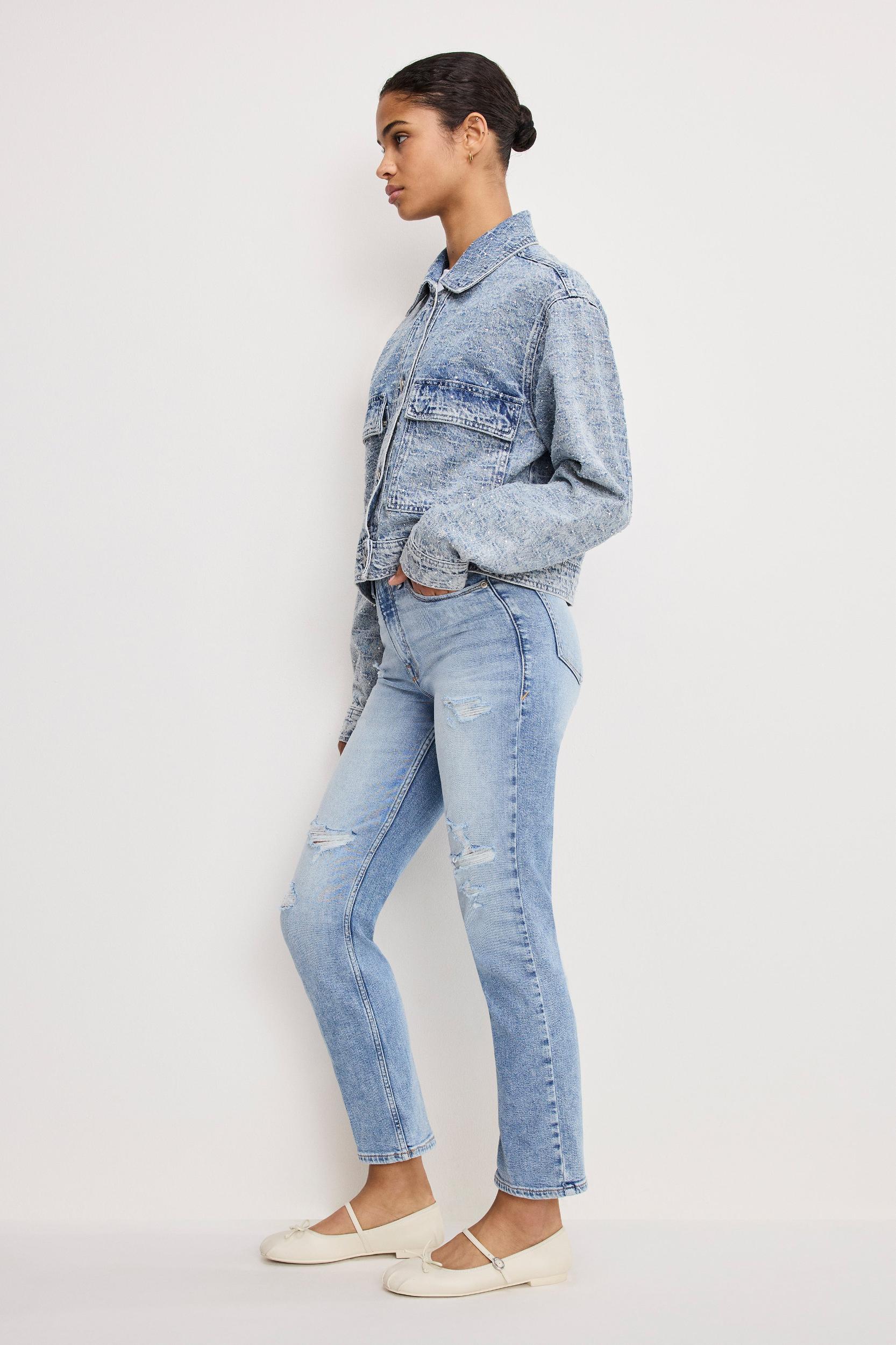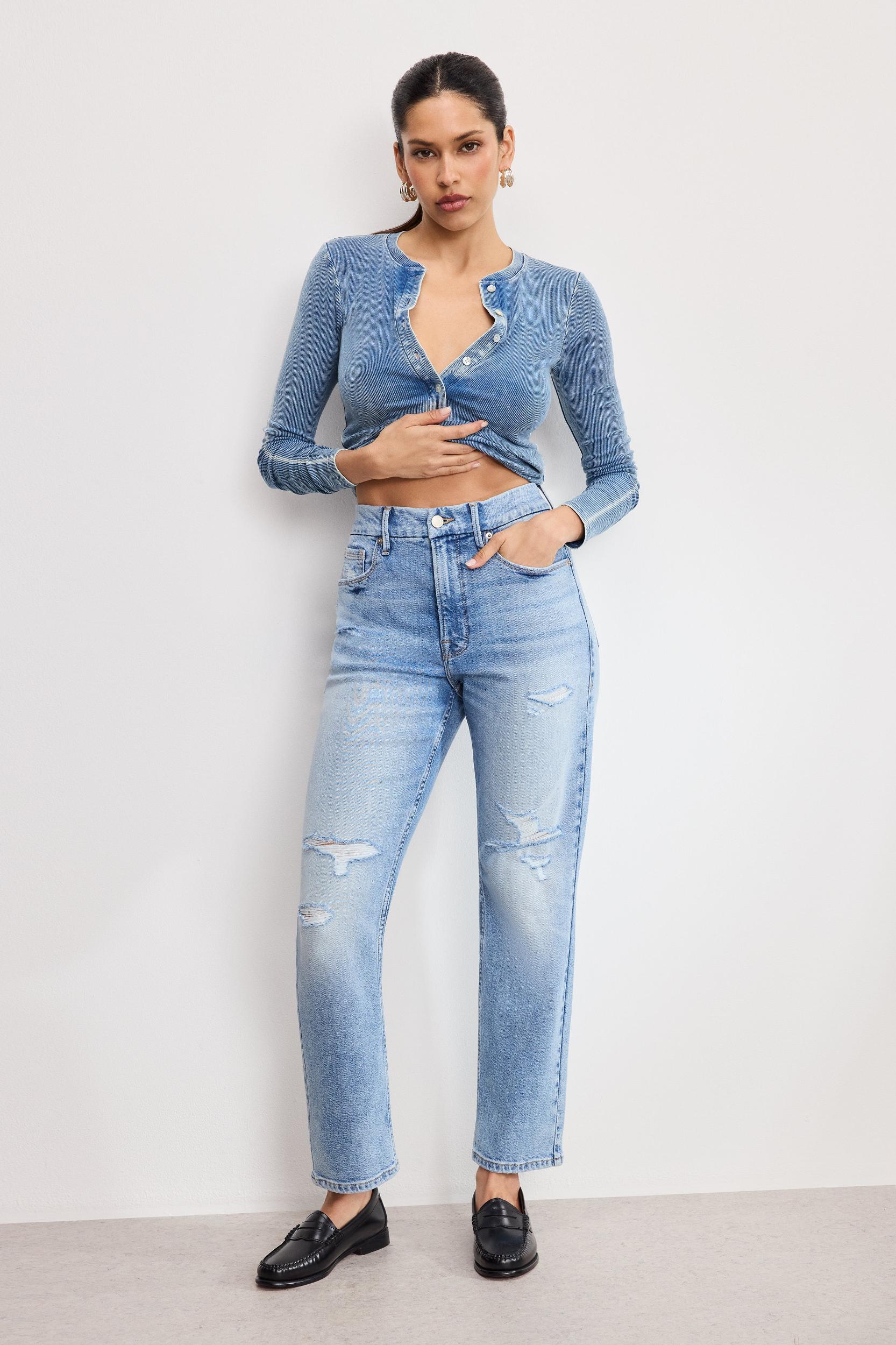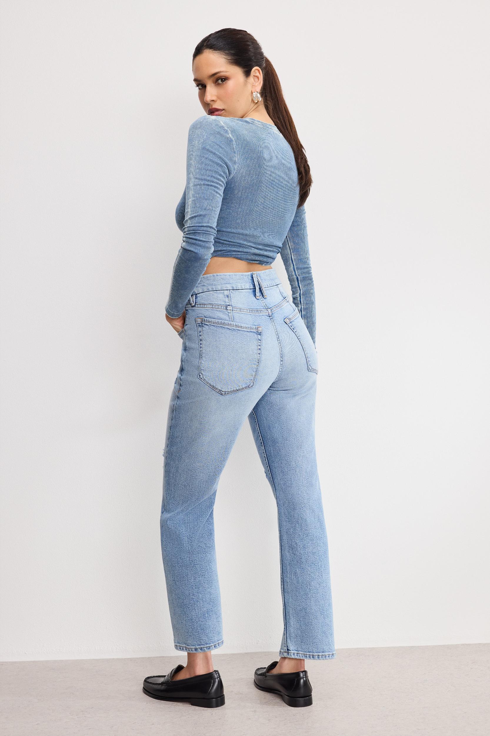 An iconic straight fit with vintage inspired straight legs, that will have you straight up obsessed. High-rise Straight legs Classic 5-pockets Front zip-fly closure Comfort denim Seaming detail Gap-proof waistband Reinforced belt loops Seaming detail at front and back Tummy smoothing technology Distressed detailing and hem Medium blue wash Inseam: 32" Model is 5'8 and wearing size 0 Fabric: 79% Cotton, 20% Recycled Cotton, 1% Elastane Care: Machine wash cold, inside out. Dry flat or hang dry. For more info, please see our denim care guide.