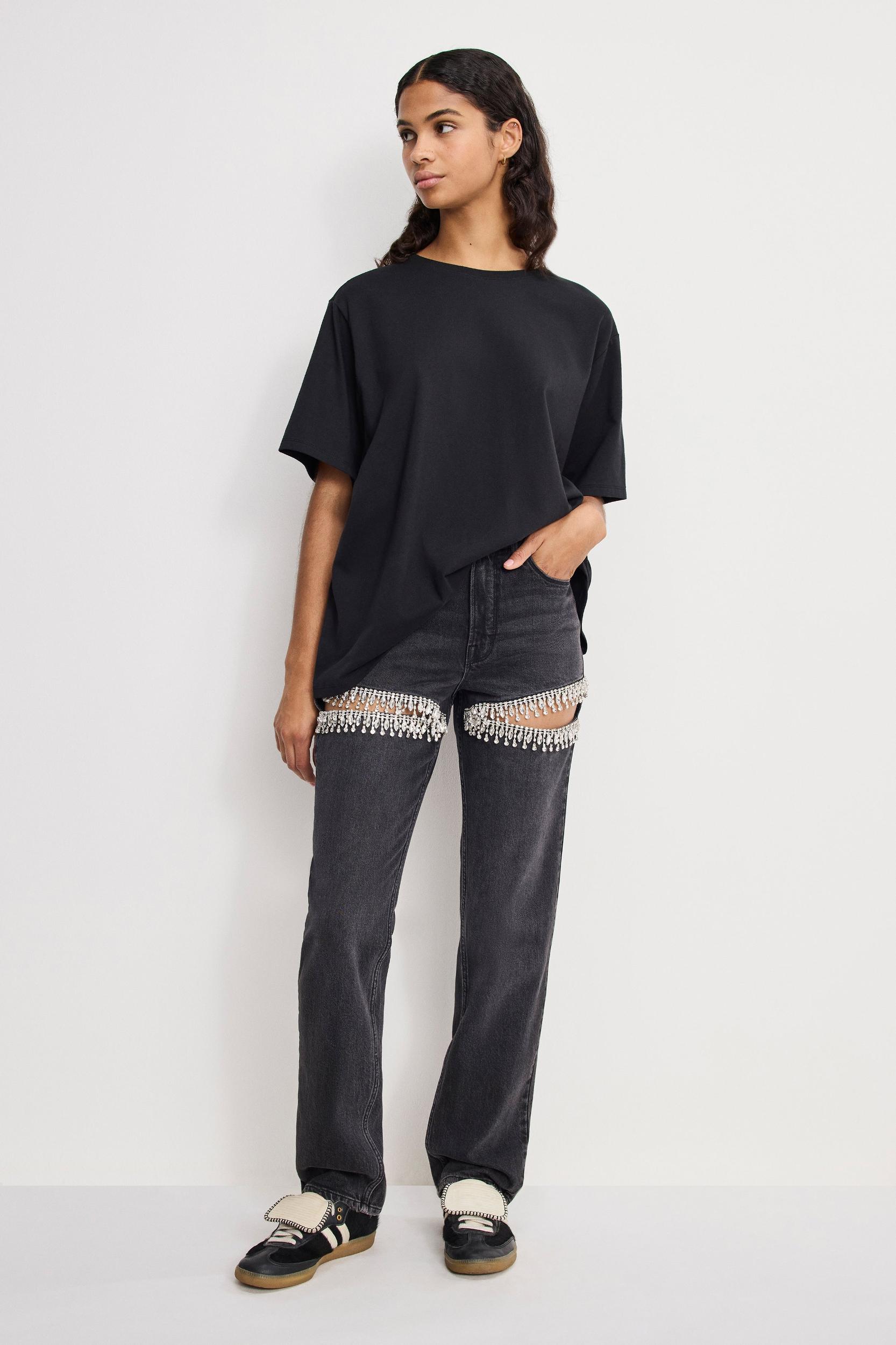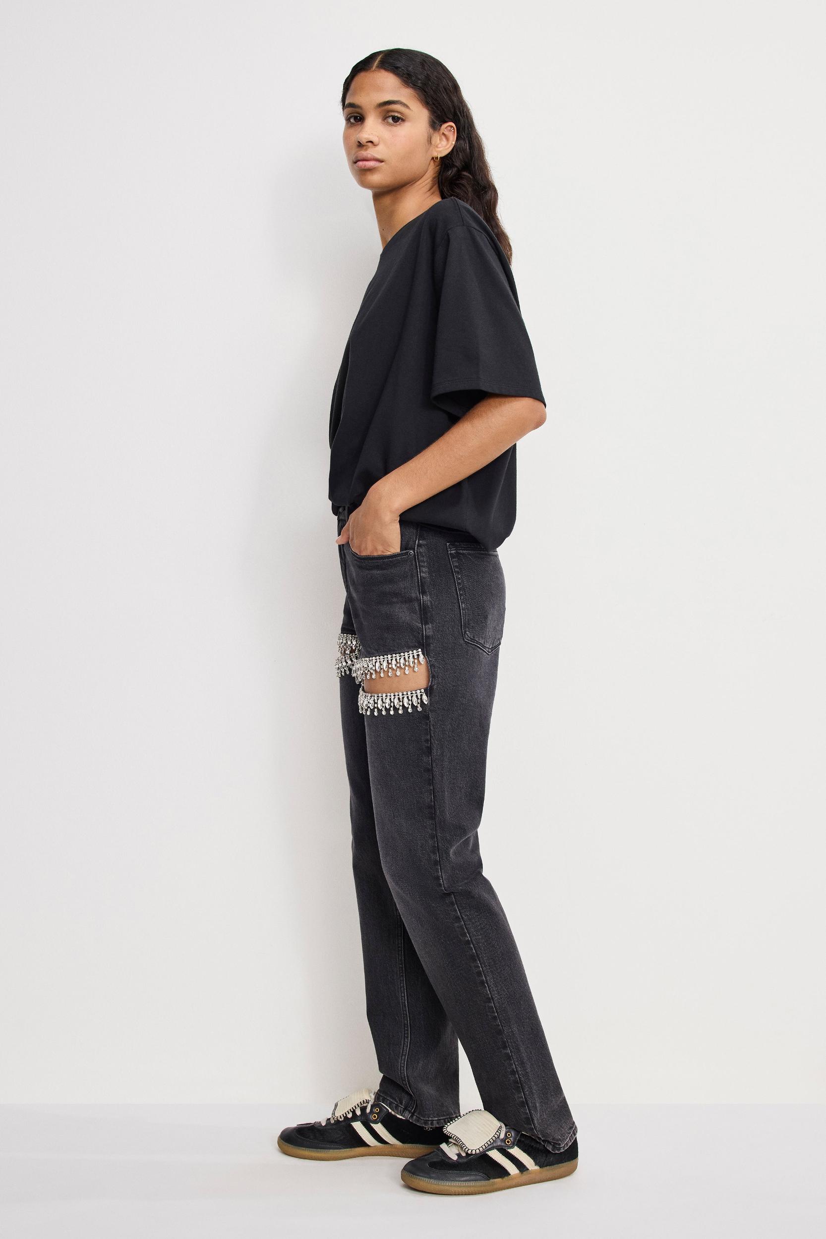 An iconic straight fit with vintage-inspired legs and shimmering diamond detailing that will have you straight-up obsessed. Jeans don’t get more iconic than this straight style, which gives you legs for days and holds you in the sexiest way possible. The Good Icon Straight Diamond Jeans feature a high rise, designed to be fitted through your hips and thighs, with a timeless straight leg from thigh to ankle. Crafted from our signature rigid denim, they provide a structured and flattering fit with exceptional shape retention, even after multiple washes and wears. High-rise Straight legs Crystal detailing throughout Classic 5-pockets Gap-proof waistband Reinforced belt loops Tummy smoothing technology Black wash Inseam: 32” Fabric: 70% Cotton, 20% Recycled Cotton, 1% Lycra Care: Machine wash cold, inside out. Dry flat or hang dry. For more info, please see our denim care guide. Model size 0 is 5'9 and wearing size 0 Model size 16 is 5'9 and wearing size 16