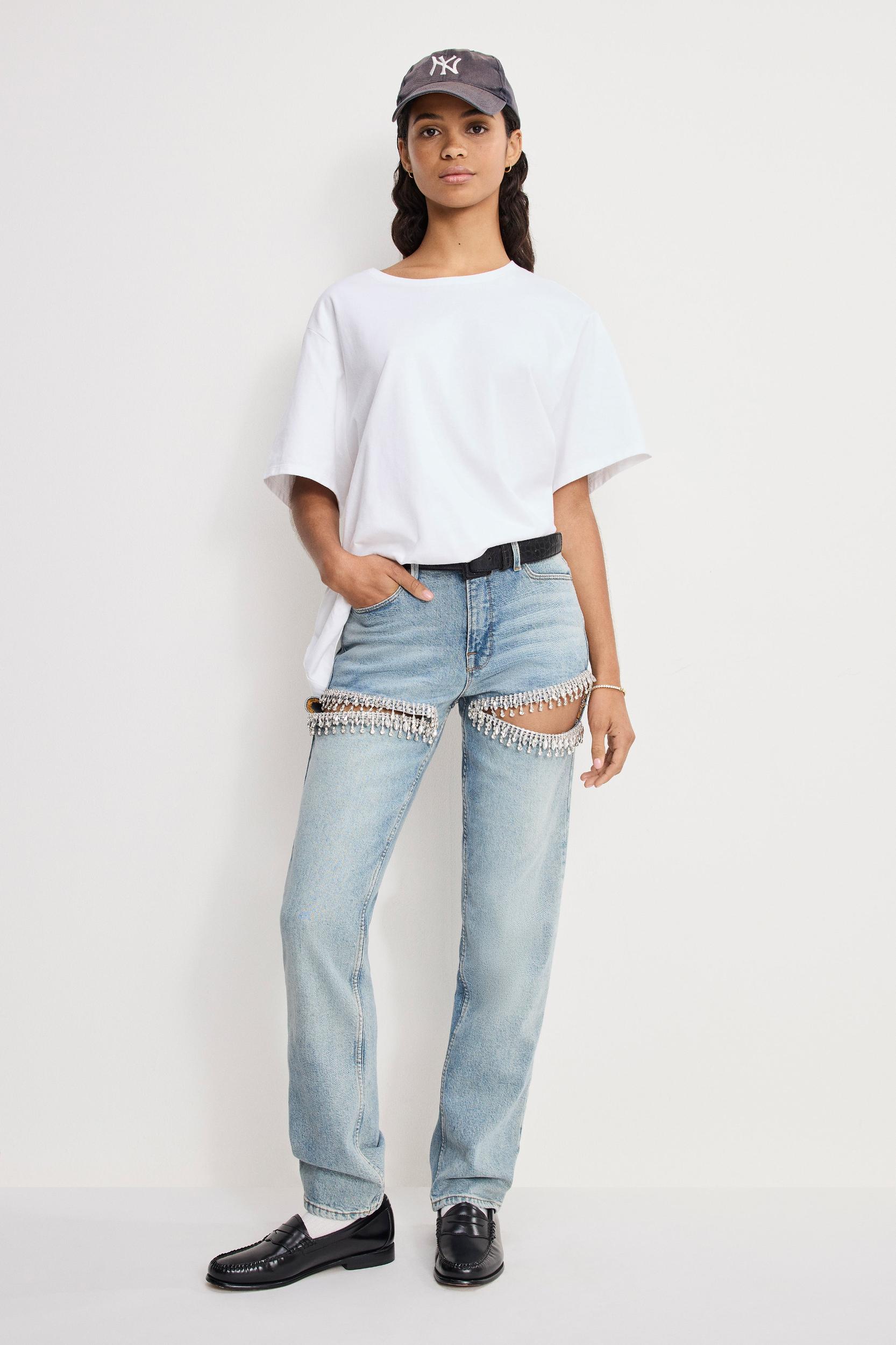 An iconic vintage-inspired silhouette, with classic straight legs and shimmering crystal detailing, that will have you straight-up obsessed. High-rise Straight legs Crystal detailing throughout Classic 5-pockets Gap-proof waistband Reinforced belt loops Tummy smoothing technology Light blue wash Inseam: 32” Fabric: 70% Cotton, 20% Recycled Cotton, 1% Lycra Care: Machine wash cold, inside out. Dry flat or hang dry. For more info, please see our denim care guide. Model size 0 is 5'9 and wearing size 0 Model size 16 is 5'9 and wearing size 16