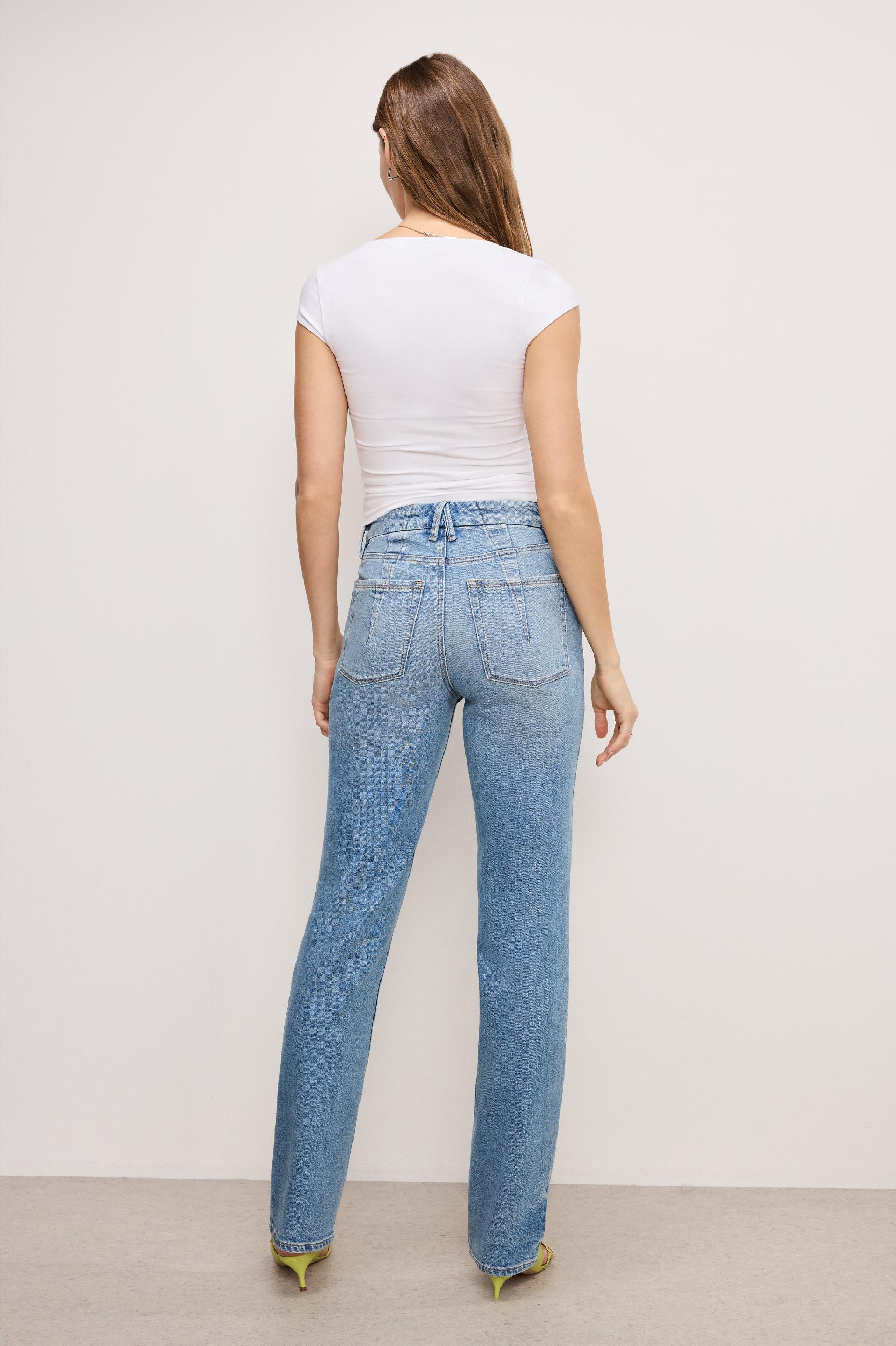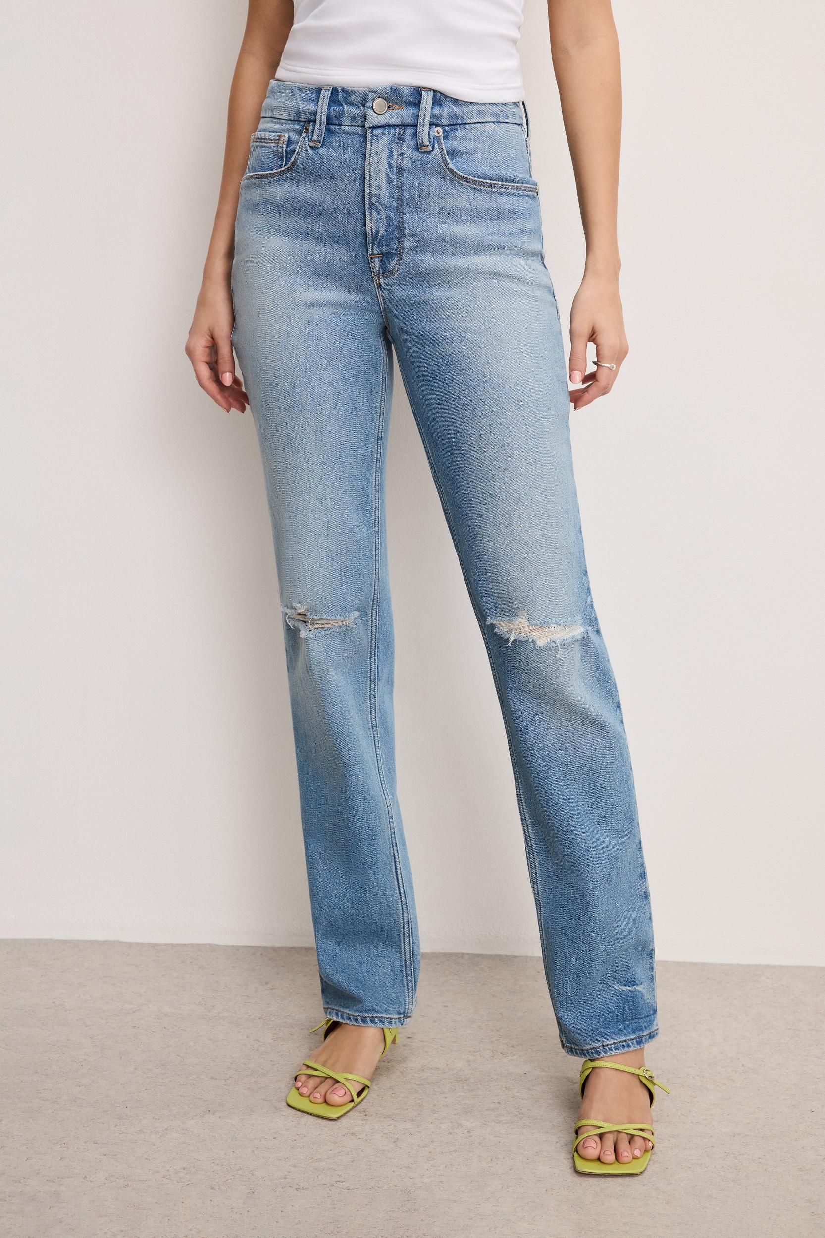 An iconic straight fit with vintage inspired straight legs, that will have you straight up obsessed. Jeans don’t get more iconic than this straight style that gives you legs for days, and holds you in, in the sexiest way possible. Good Icon Straight Jeans feature a high-rise, designed to be fitted through your hips and thighs with a timeless straight leg from thigh to ankle. Crafted from our signature comfort denim, Good Icon Straight Jeans provide a structured and flattering fit with exceptional shape retention, even after multiple washes and wears. High-rise Straight legs Tacked hem Ripped detailing Comfort denim Classic 5-pockets Front zip-fly closure Gap-proof waistband Reinforced belt loops Tummy smoothing technology Medium light blue wash Inseam: 32" Fabric: 81% Cotton, 1% Elastane, 18% Cotton Lyocell