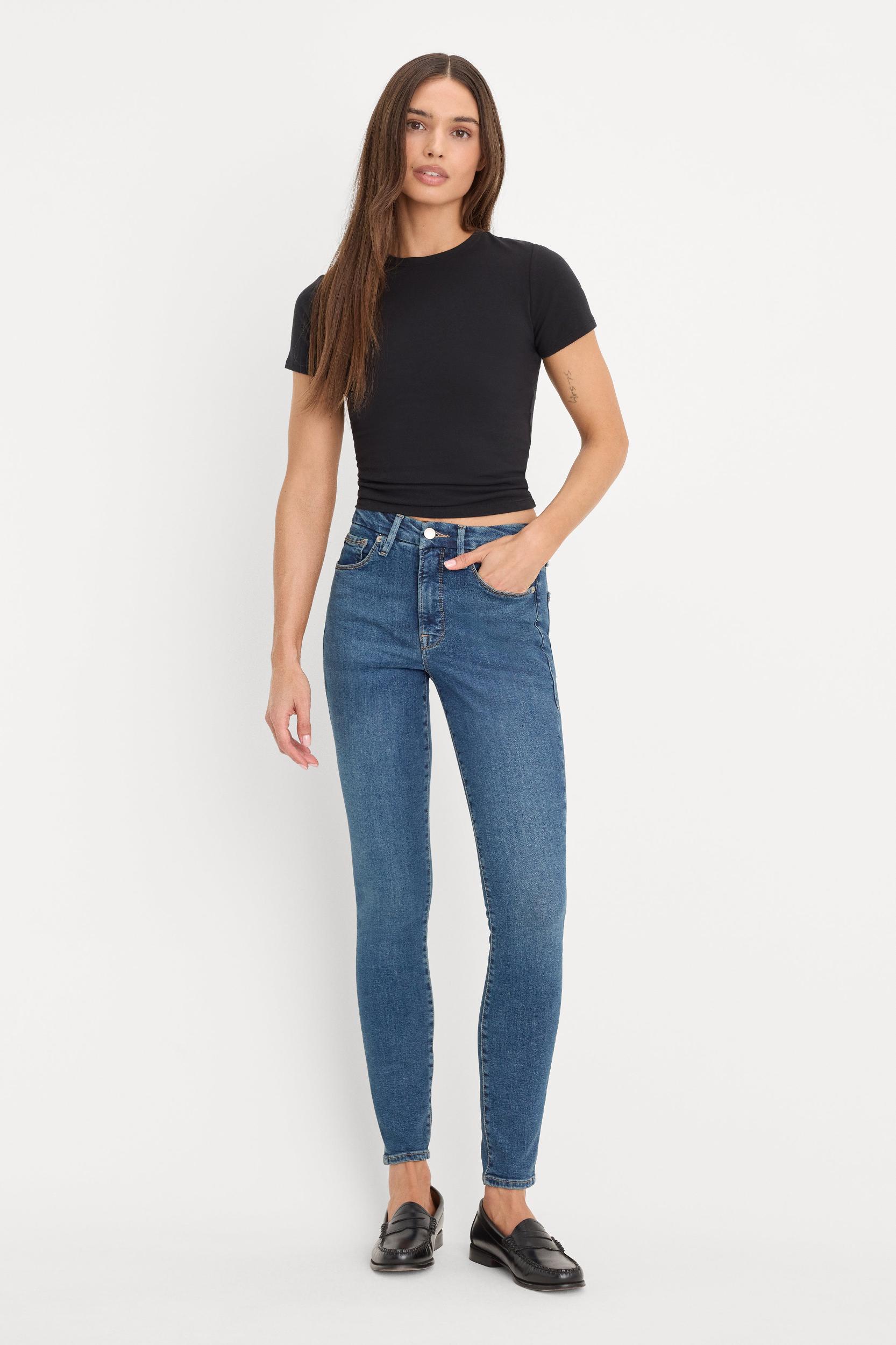 Our best-selling jeans since day one. Good Legs are the body-hugging, booty shaping jeans of your dreams. Mid-rise Skinny legs Classic 5-pockets Front zip-fly closure Gap-proof waistband Reinforced belt loops Tummy smoothing technology Dark blue wash Inseam: Short 26" | Regular 29" | Long 35" Fabric: 93% Cotton , 5% Polyester, 2% Elastane Care: Machine wash cold, inside out. Dry flat or hang dry. For more info, please see our denim care guide. Model size 0 is 5'9 and wearing size 0 Model size 16 is 5'11 and wearing size 16