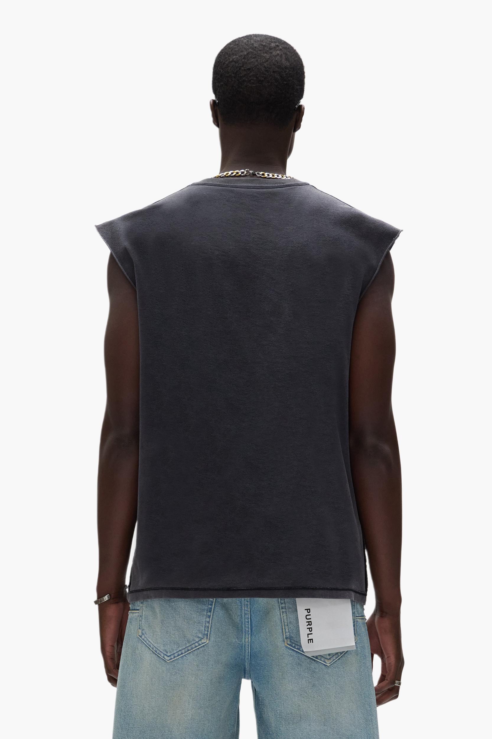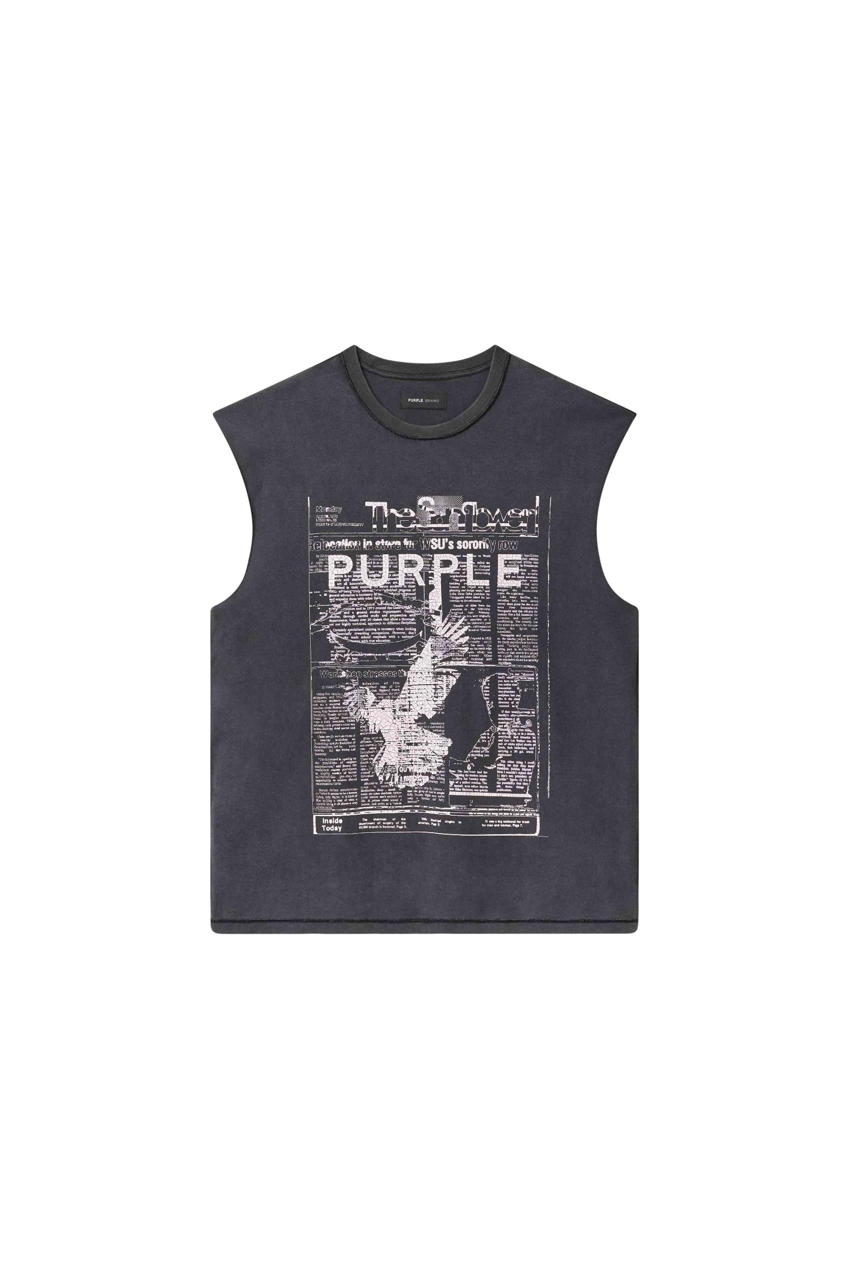 Designed for a regular fit, this acid-washed sleeveless tee comes in a textured jersey knit made from 100% cotton. It features a news print and Purple brand lettering across the chest with a crackle finish. Pre Fall 2025 White Label 100% Cotton 30" Length, 22 1/4" Chest Regular Fit Textured Jersey Acid Wash Crackle Print