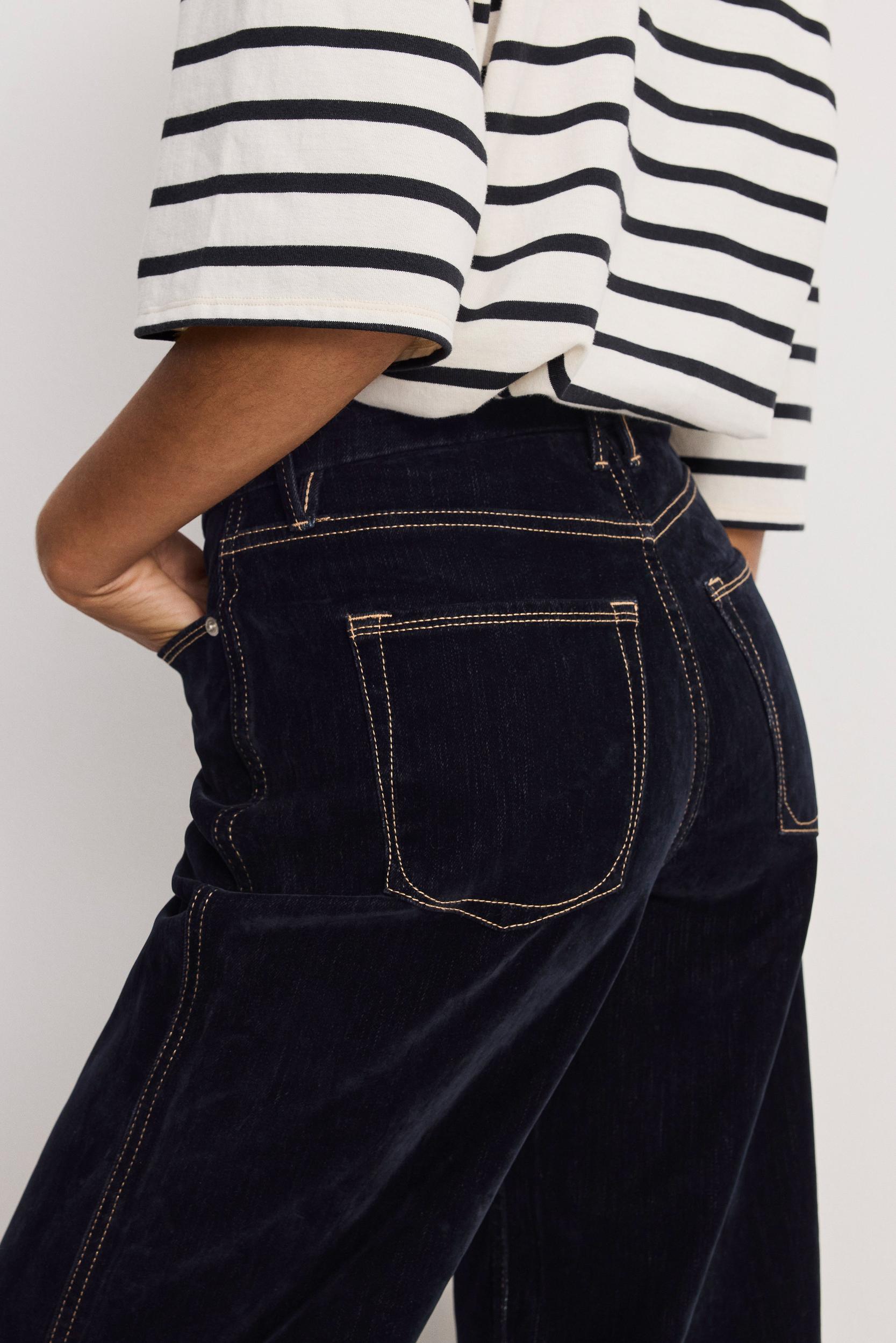 Our best-selling skate-inspired denim style, now in flocked denim. The Flocked Good Skate Jeans sit high on the waist and feature wide, loose legs that offer an effortless laid-back look. Crafted from flocked denim with a touch of stretch, these pants offer optimal comfort and a lustrous and luxurious look. High-rise Wide legs Clean hem Comfort stretch Classic 5-pockets Front zip-fly closure Gap-proof waistband Reinforced belt loops Tummy smoothing technology Dark blue flocked denim Inseam: 34" Model is size 0, 5’9” and wearing size 0. Fabric: 75% Cotton, 13% Polyester, 10% Rayon, 2% Spandex Care: Wash inside out in cold water with like colors. Do not bleach. Tumble dry on low. Iron on low heat. Do not dry clean.