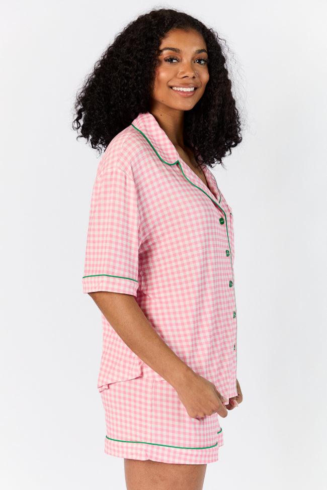 Details Pink Gingham Short Sleeve Pajama Top Fabric has stretch, relaxed fit Collared button down v-neckline with short sleeves and functional pocket Pair this set with slippers! Unlined Size small from shoulder to hem: 24" Ultra-soft and gets softer with each wash Bamboo fiber is breathable, moisture-wicking, temperature regulating and cooling for your best sleep! Material and Care 95% rayon, 5% spandex Hand wash, dry flat Patterns may vary Materials may have natural variations Colors may vary from different viewing devices.