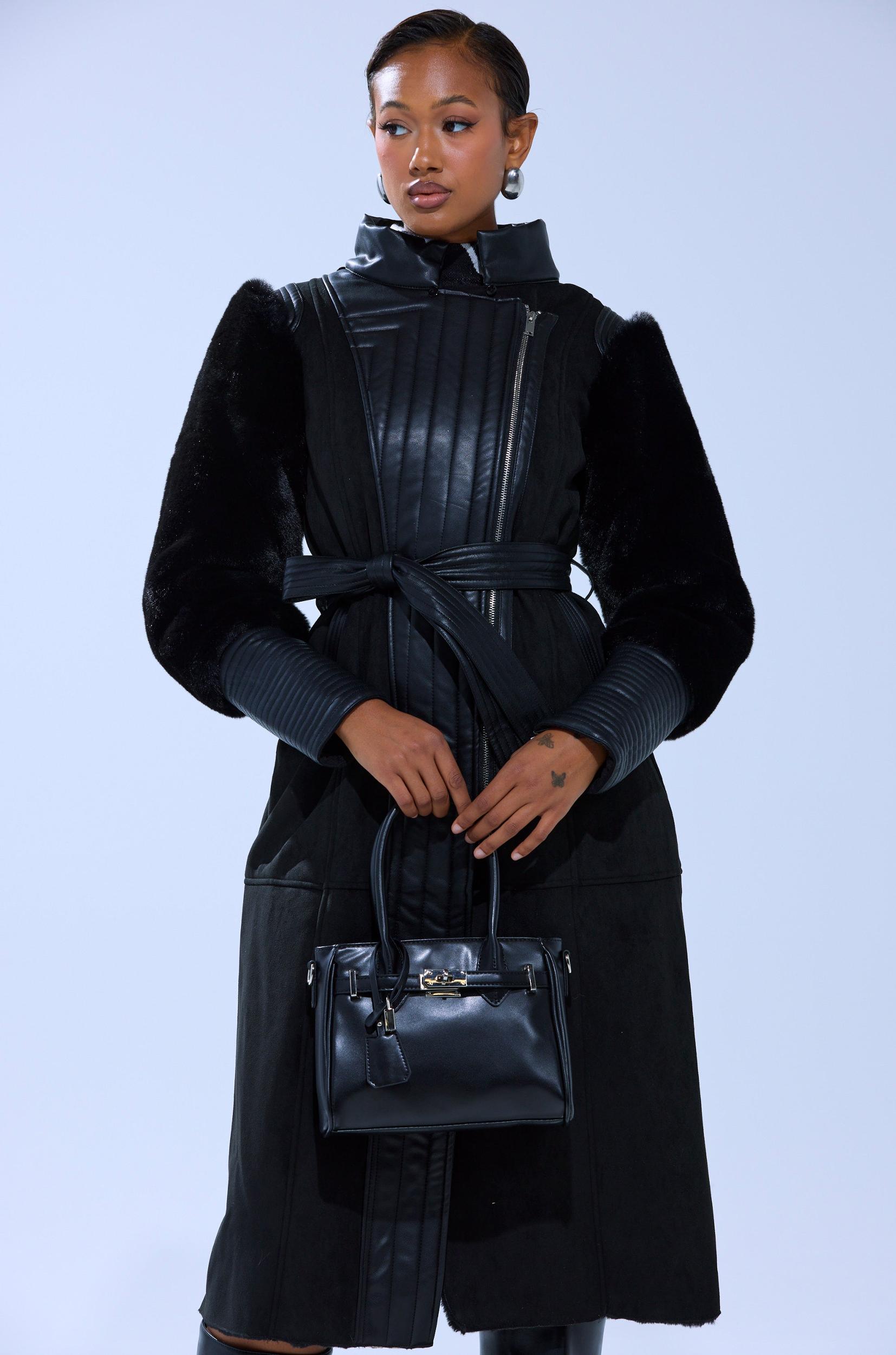 The AKIRA Label Goodie Mixed Media Coat is crafted from a variety of materials including a lush faux fur, vegan leather, and a buttery smooth suede base. This elegant outerwear piece boasts an oversized fur collar, coordinating long fur sleeves with tonal, textured faux leather cuffs, a striped panel of tonal leather running down the front, roomy side pockets with leather detailing, and a coordinating leather self-tie waist belt. Complete with a metallic front zip closure, a cozy fur inner lining, and a longline silhouette. Pair with flared leather pants and stiletto booties for a chic finish. - Shell 1: 100% Polyester, Shell 2: 100% PU, Lining: 100% Polyester- Dry Clean Only- No Stretch- Imported (all measurements approximate from size small)- 46” Shoulder to Hem- 18” Shoulder to Shoulder- 24” Sleeves- Model is 5’9” and is wearing size smallProduct ID: 433575 (all measurements approximate from size 1X)- 48” Shoulder to Hem- 20” Shoulder to Shoulder- 25” SleevesProduct ID: 433579
