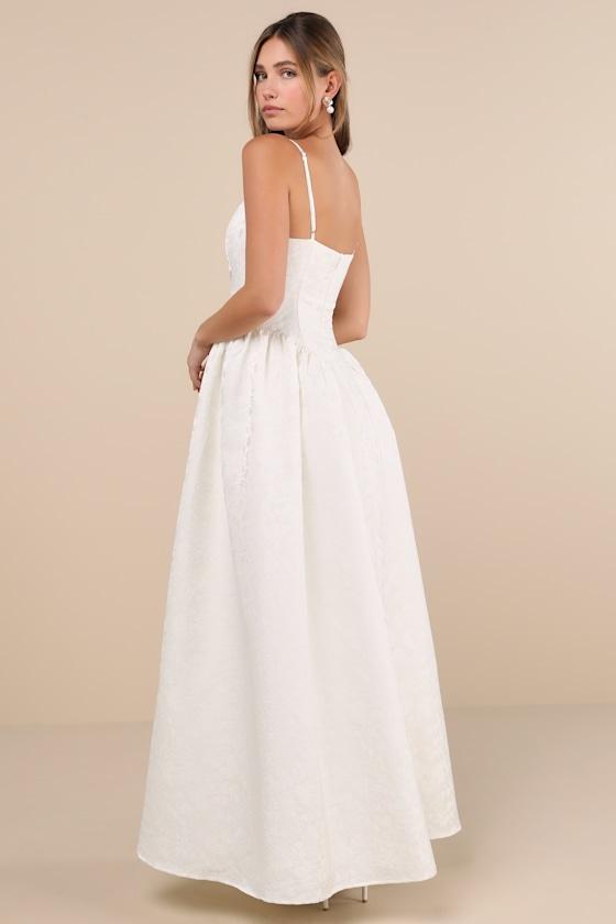 Prepare to be the all that anyone can talk about when you arrive in the Lulus Gorgeous Extravagance White Floral Jacquard Maxi Dress! Sleek woven fabric boasts a chic floral jacquard design throughout as it shapes a princess-seamed bodice, a straight neckline, and adjustable spaghetti straps. The fitted waist sits atop an A-line skirt with gathered, pannier-style panels at the sides and an elegant maxi hem. Hidden back zipper/clasp.