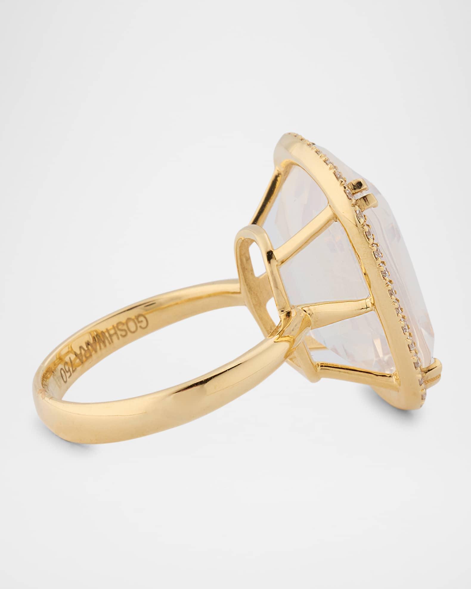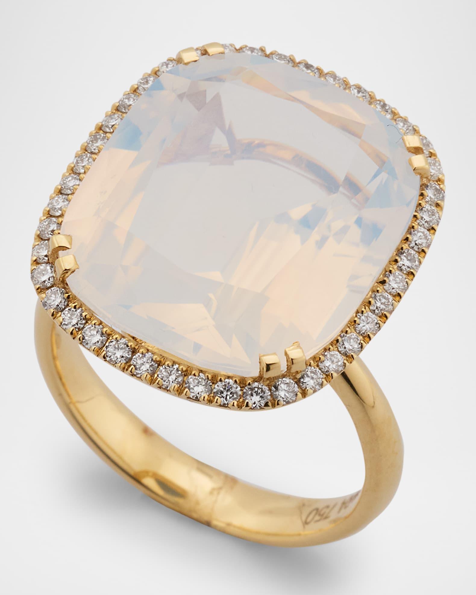 A faceted moon quartz is the star of this Goshwara Gossip ring. White diamonds create a glistening halo for the large iridescent stone. Approx. 0.5" length Polished 18-karat yellow gold Diamond total carat weight: 0.42 Easily clean with soap and water Imported