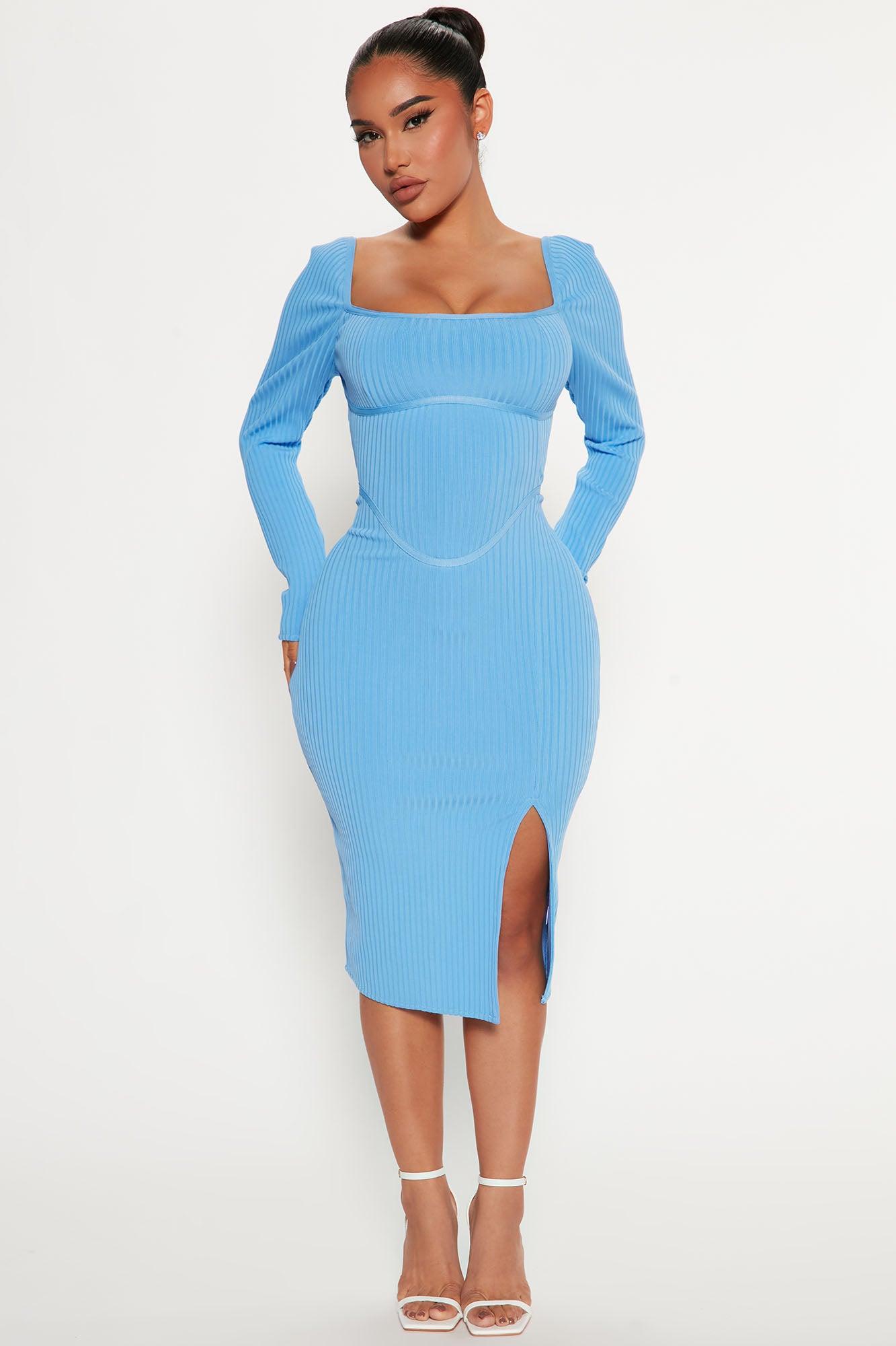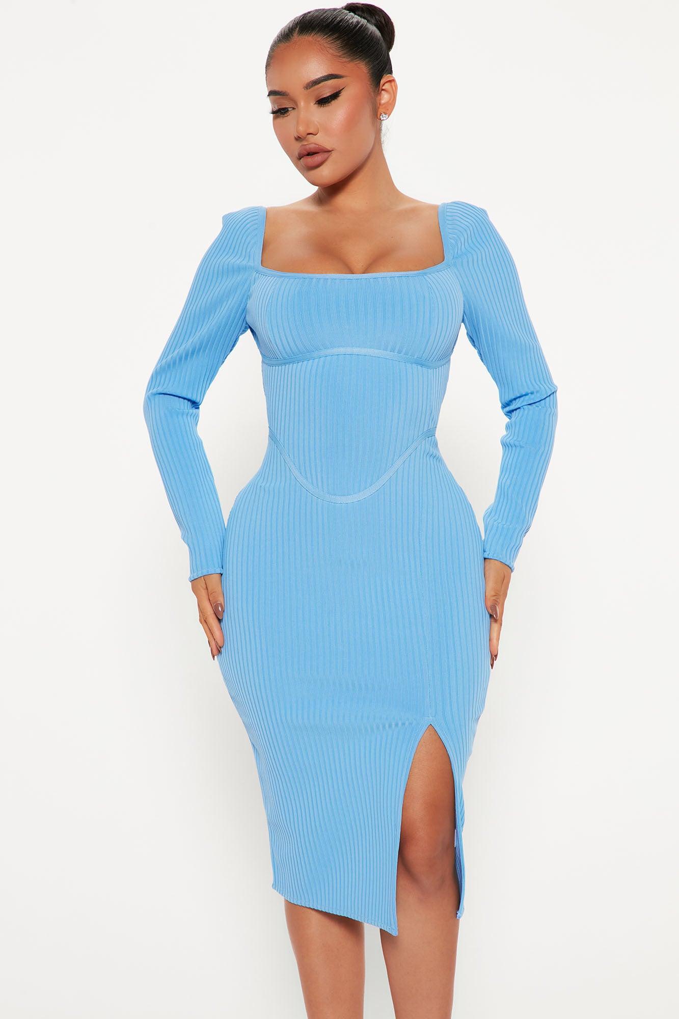 Available In Blue And Orange. Bandage Midi Dress Long Sleeve Square Neck Stitching Detail Slit Hidden Back Zipper Stretch 95% Polyester 5% Spandex Imported