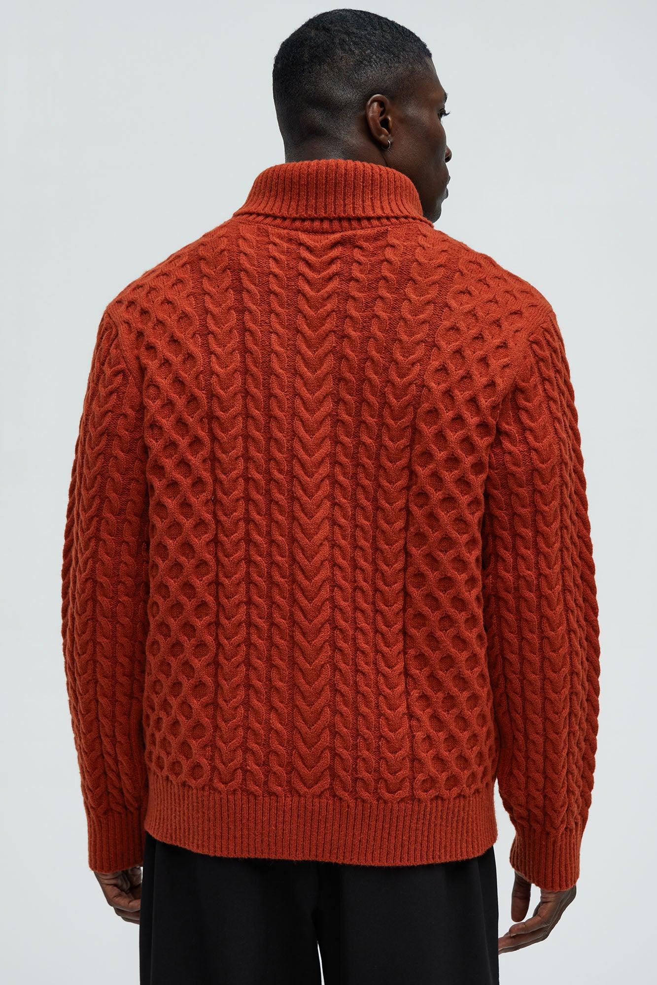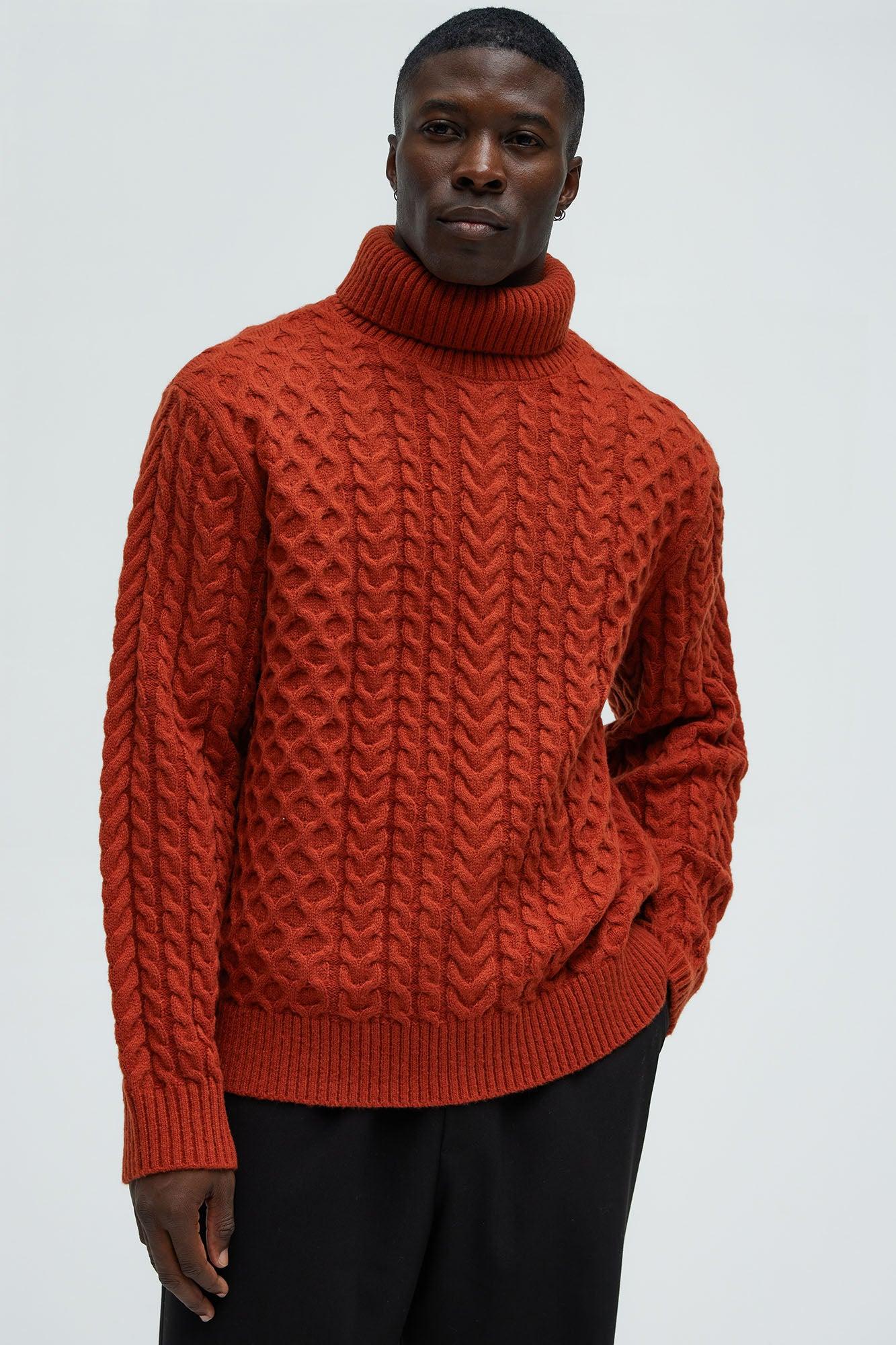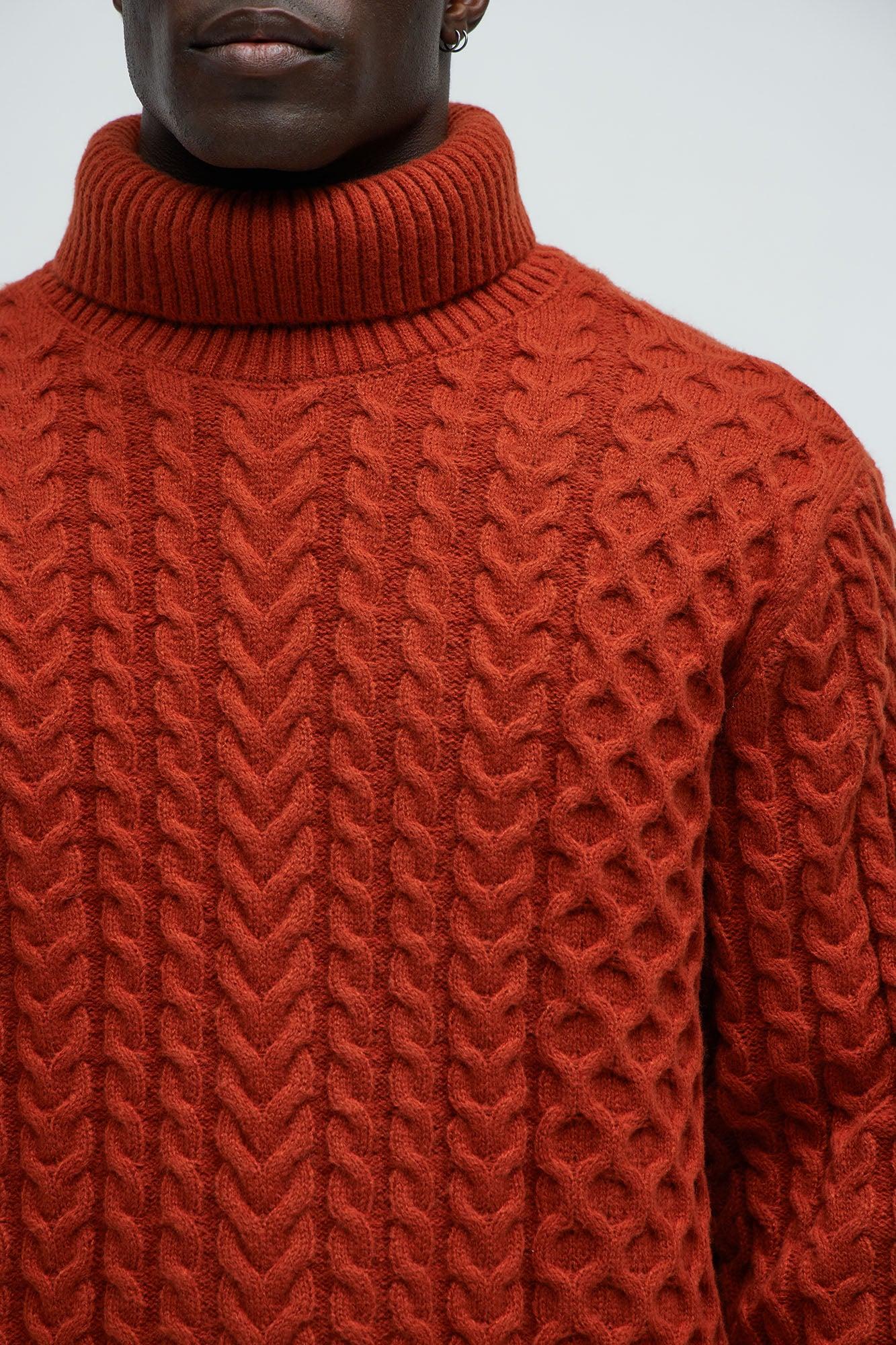 Available In Rust. Turtleneck Cable Knit Sweater Long Sleeve Ribbed Collar Ribbed Cuffs 100% Polyester Imported California Proposition 65 WARNING: Cancer and Reproductive Harm - www.P65Warnings.ca.gov.