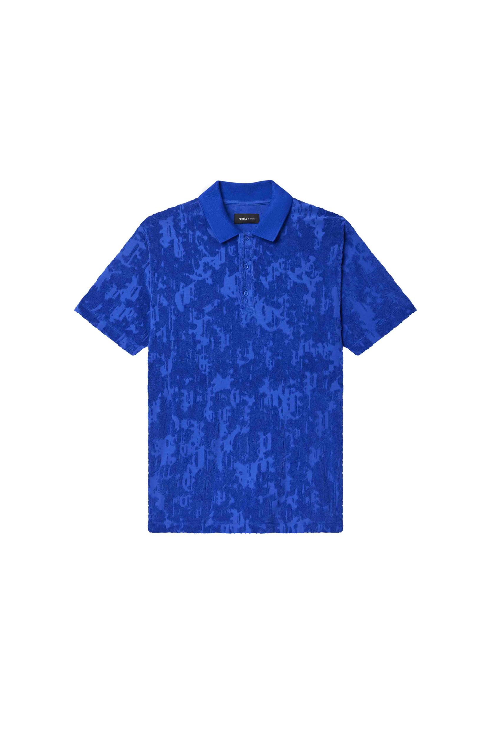 Cut from terry jacquard, woven with a camo pattern, this short-sleeve polo tee is designed to a standard fit, with a classic shirt collar and a three-button placket. Pre Fall 2025 White Label 76% Cotton / 24% Polyester 29 3/4" Length, 25 1/2" Chest, 18 5/8" Sleeve Regular Fit Jacquard Terry Towel