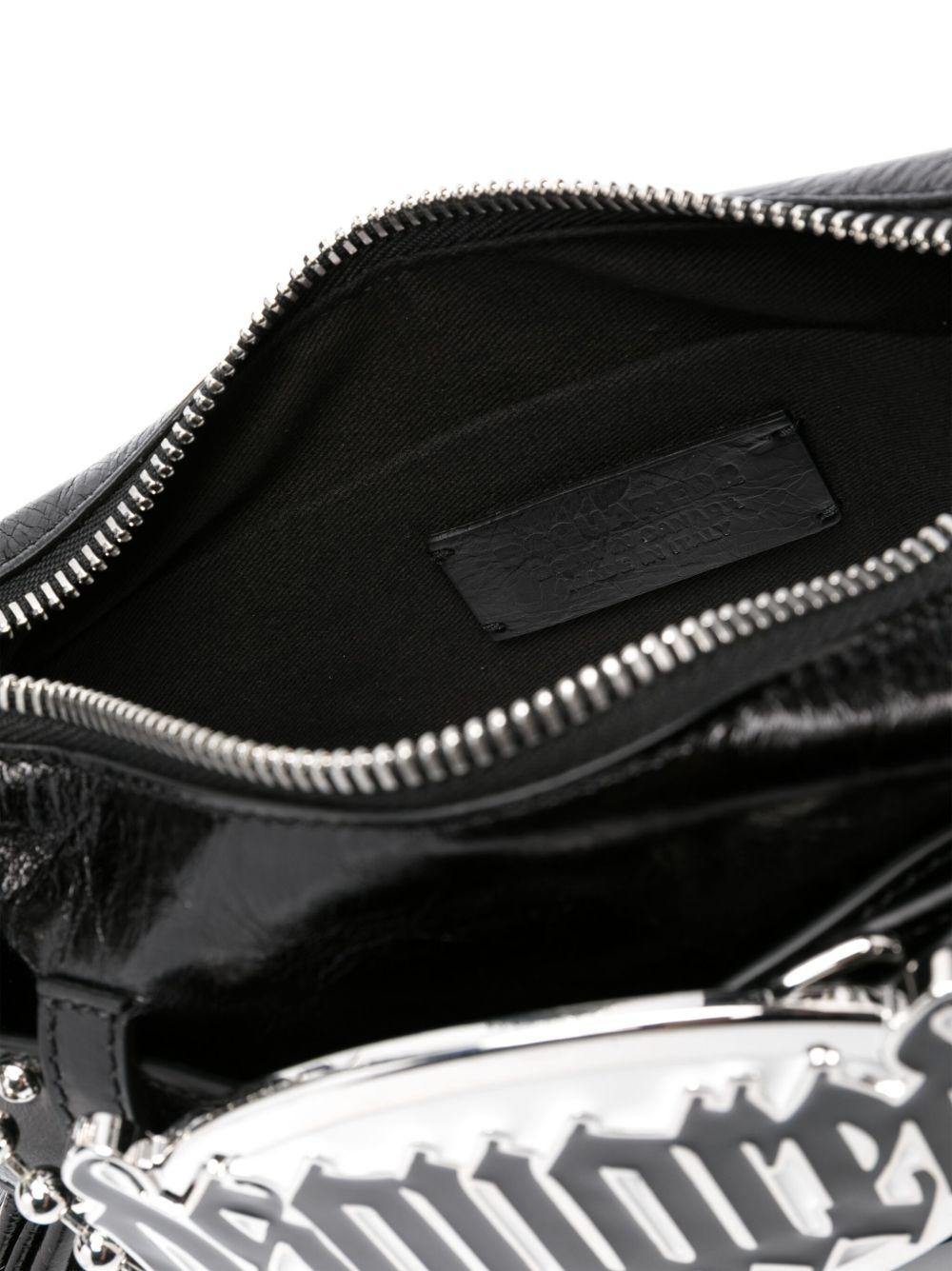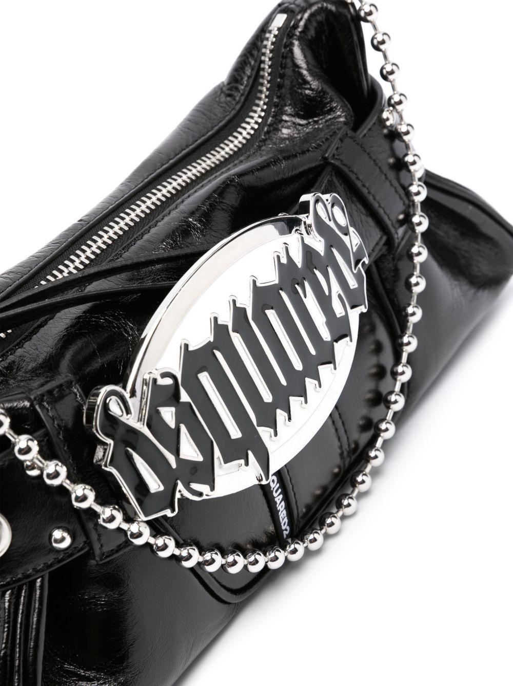 DSQUARED2 Gothic leather shoulder bag | Black | black | calf leather | patent finish | silver-tone logo plaque | silver-tone hardware | decorative buckle detailing | single detachable top handle | single chain-link top handle | top zip fastening | main compartment | internal logo patch | internal slip pocket | Calf Leather | Shoulder Bags | Bags | Women